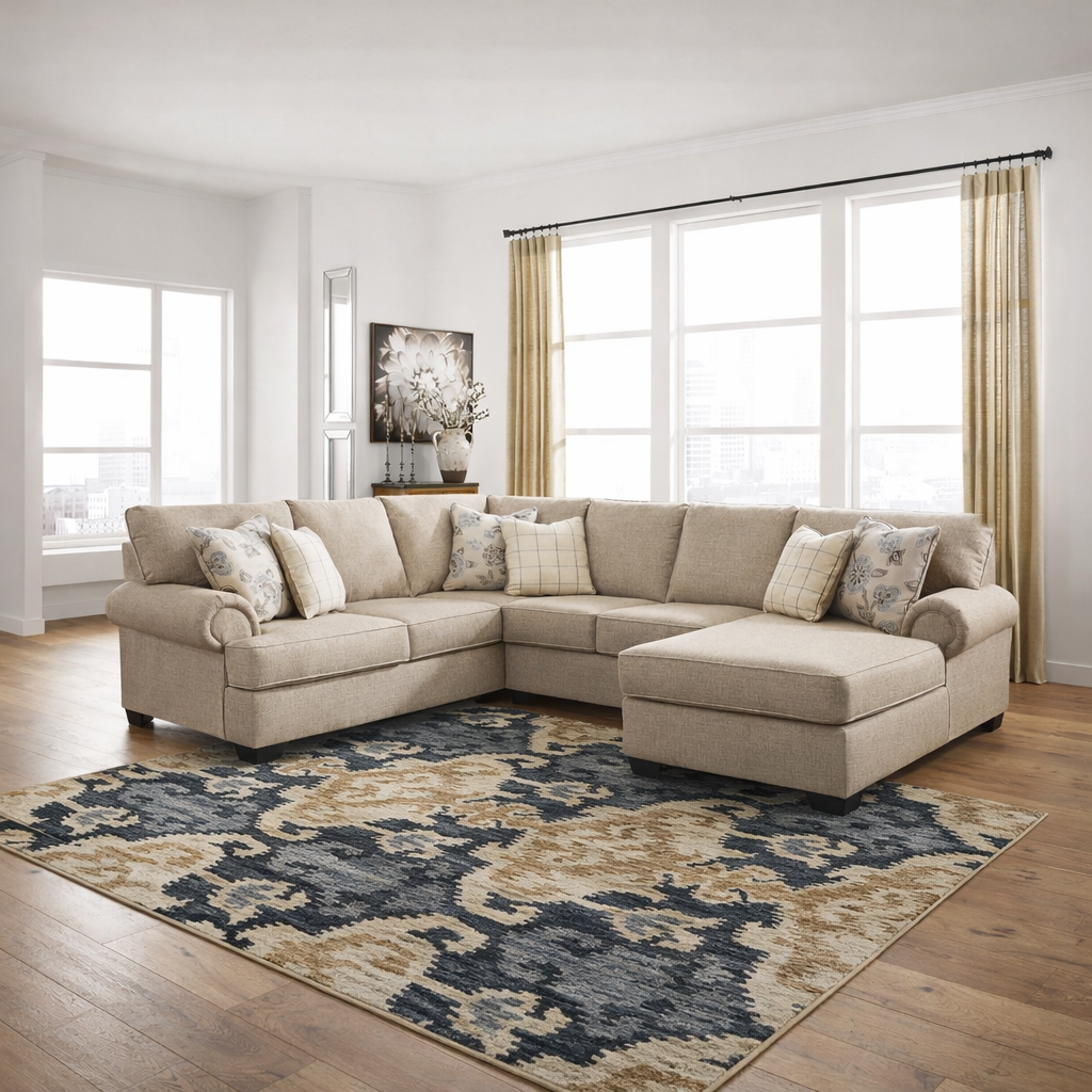 • تتضمن 4 قطع: كرسي استرخاء زاوية مواجه للذراع الأيمن، وأريكة بدون أذرع، وكرسي بدون أذرع، وأريكة مواجهة للذراع الأيسر مع إسفين زاوية