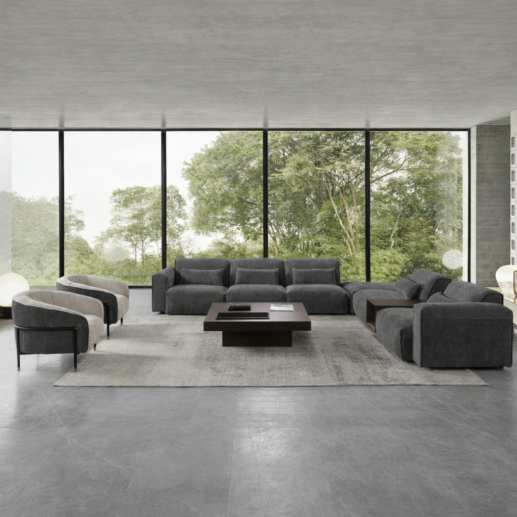 أقسام حديثة ومقسمة تم تصميمها بشكل فريد لتتمكن من تحريكها وتحسينها لتناسب احتياجات منزلك. تؤسس هذه الأقسام أرضية جديدة من المرونة والأناقة لتناسب مكانك تمامًا. يمكنك ترتيب ومزج قطع الأقسام بشكل إبداعي لمناسبات مختلفة. إنها تحقق التوازن المثالي بين التصميم الحديث والبسيط لتوفير راحة تشبه السحاب.