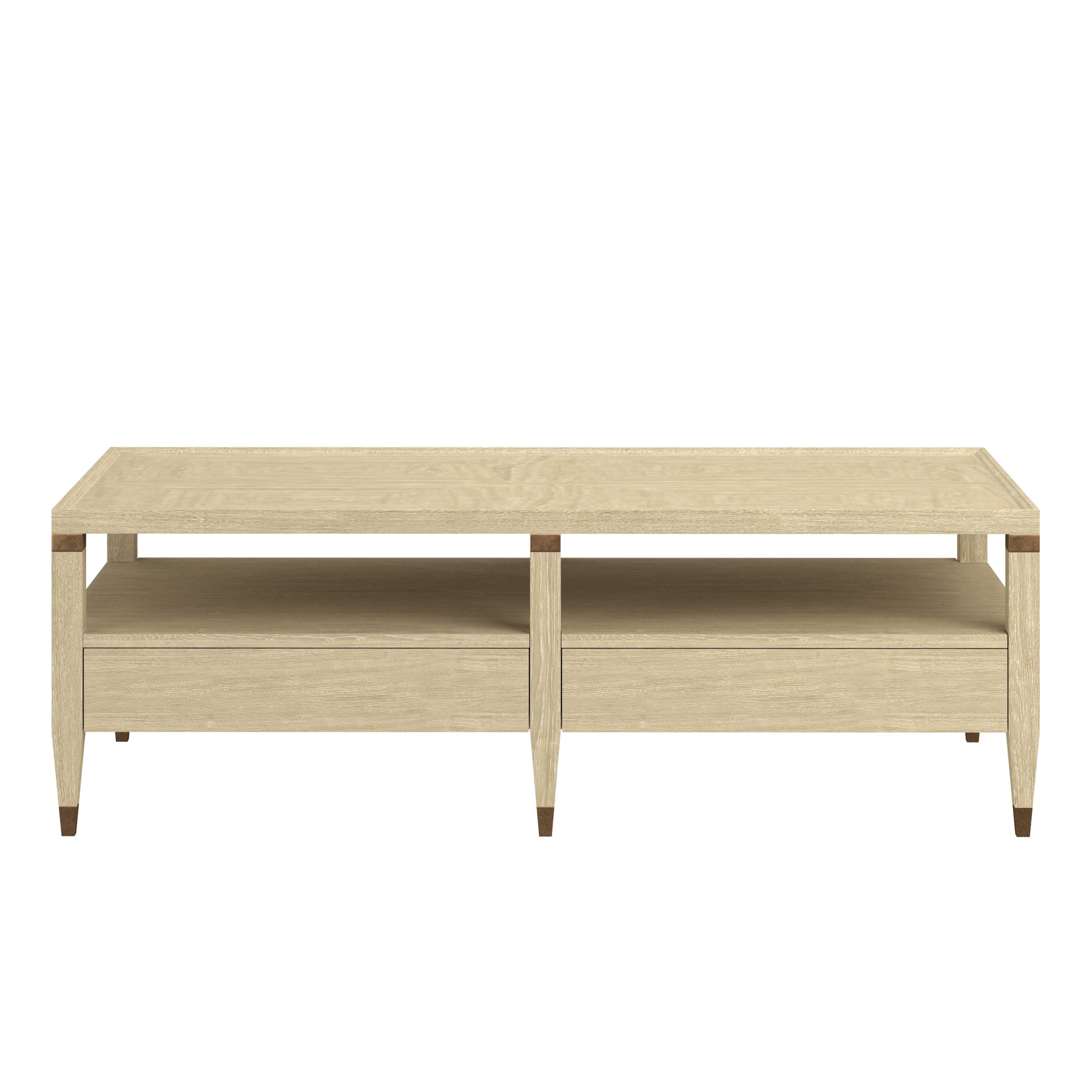 Introduce a touch of contemporary elegance and functional design to your living space with the Eave II Rectangular Cocktail Table. This piece, from the esteemed Eave II collection, combines clean lines with subtle textural details. The table features a smooth, rectangular top, crafted from a light, natural wood that exudes a sense of calm and refinement. The table's design is enhanced by its open, tiered structure, providing both display and storage options. The lower tier includes two drawers, offering concealed storage for remote controls, magazines, or other living room essentials. The drawers are seamlessly integrated into the design, maintaining the table's clean aesthetic. The table rests on slender, tapered legs with metallic accent tips, adding a touch of contemporary elegance and lightness. The Eave II Rectangular Cocktail Table is designed to be a stylish and functional centerpiece for your living space, perfect for both casual gatherings and everyday use. Its refined design allows it to seamlessly integrate into a variety of interior styles, adding a touch of understated luxury.
