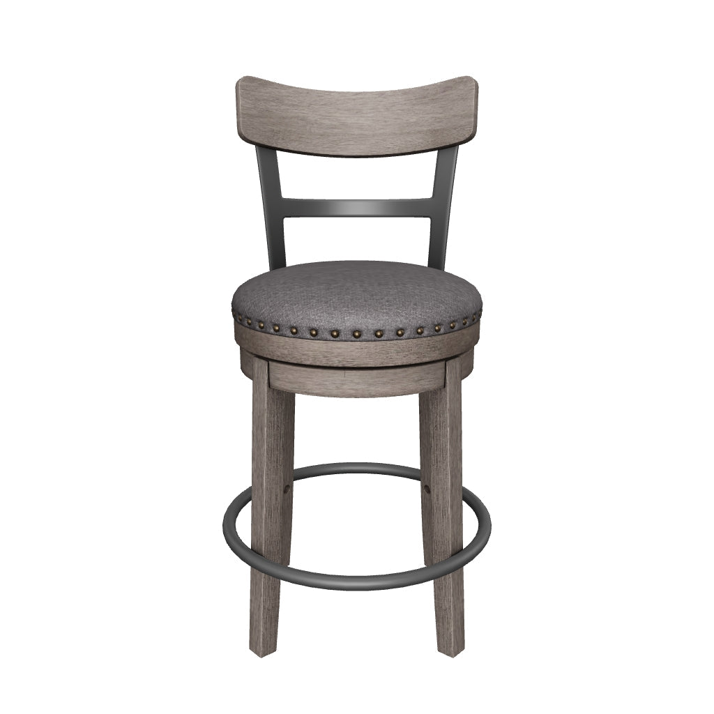 كرسي بار دوار UPH (1/CN)، داكن، مصنوع من الخشب الصلب؛ لمسة نهائية رمادية عتيقة؛ تنجيد بوليستر رمادي محكم على مقعد مبطن بالإسفنج؛ دوران سلس بزاوية 360 درجة؛ زخرفة بمسامير؛ يناسب بشكل جميل المزرعة الحديثة والمساحات المعاصرة؛ يتطلب التجميع