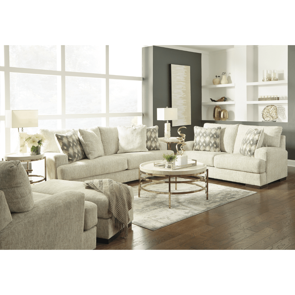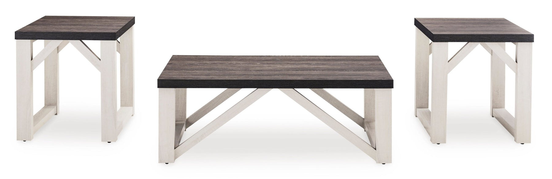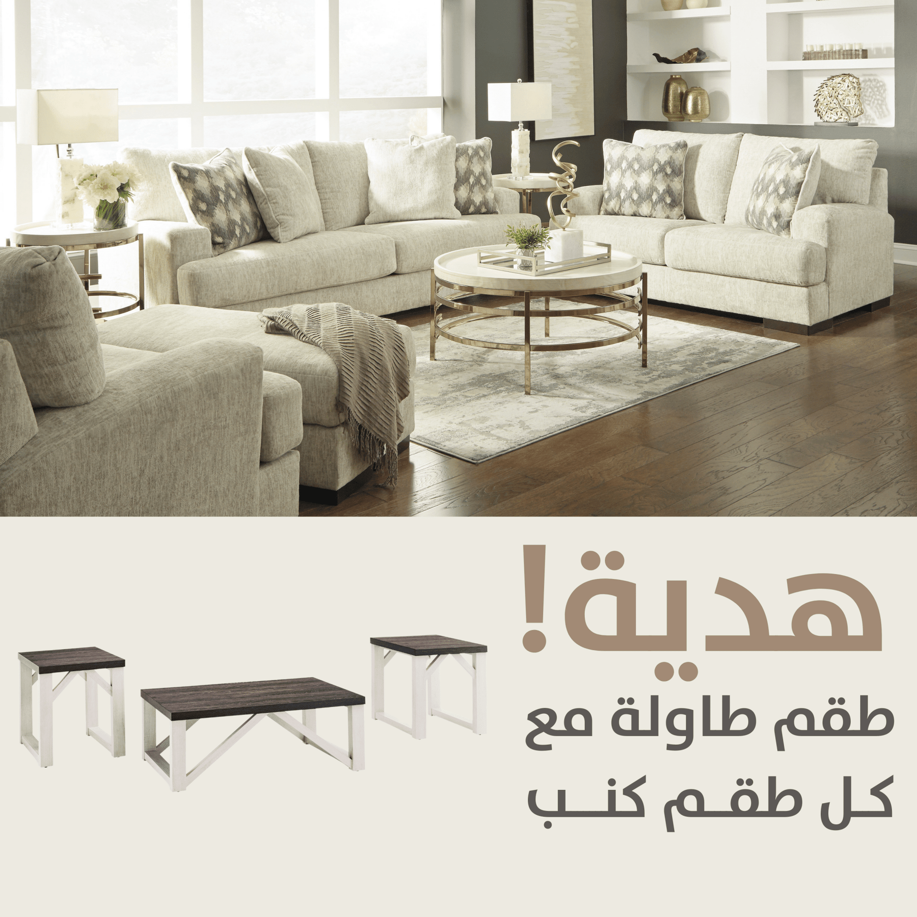 تتضمن طاولة قهوة وطاولتين جانبيتين؛ مصنوعة من صفائح زخرفية وركيزة من ألواح متوسطة الكثافة؛ سطح خشبي رمادي اللون؛ قاعدة بيضاء عتيقة؛ يلزم التجميع