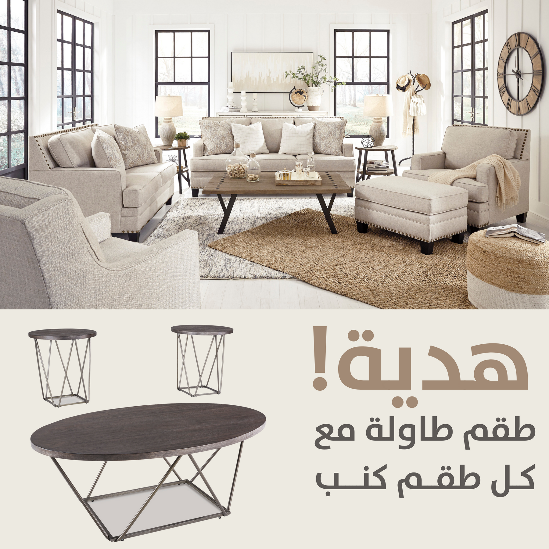 تتضمن طاولة كوكتيل بيضاوية وطاولتين دائريتين في الطرف؛ مصنوعة من قشرة خشب الدردار والخشب الهندسي؛ لمسة نهائية بنية رمادية اللون؛ قاعدة جسر مع جماليات خطية رفيعة