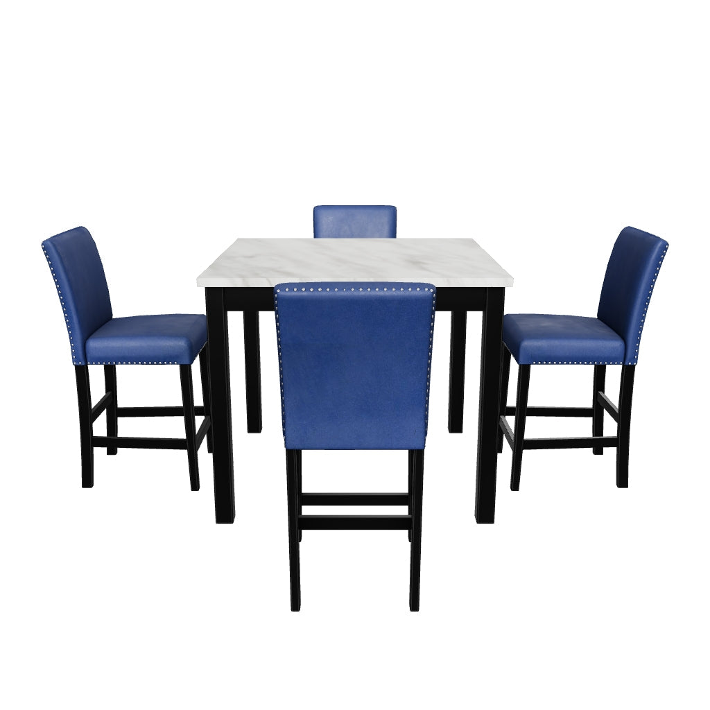 قماش؛ رخام/حجر و/أو ما يشبه الحجر؛ منتجات خشبية ومنتجات أخرى، مجموعة طاولة طعام بارتفاع الطاولة و4 كراسي بار مبطنة؛ طاولة مصنوعة من الخشب والخشب الهندسي؛ سطح الطاولة مع رقائق رخام كارارا مقلدة؛ كراسي بار مصنوعة من الخشب؛ كراسي البار مبطنة بمخمل أزرق؛ حواف معدنية بمسامير؛ تتميز كراسي البار بوسادة إسفنجية عالية المرونة ملفوفة بألياف بوليستر سميكة؛ إطارات بلمسة نهائية سوداء غير لامعة؛ تتسع لـ 4 مقاعد؛ يلزم التجميع