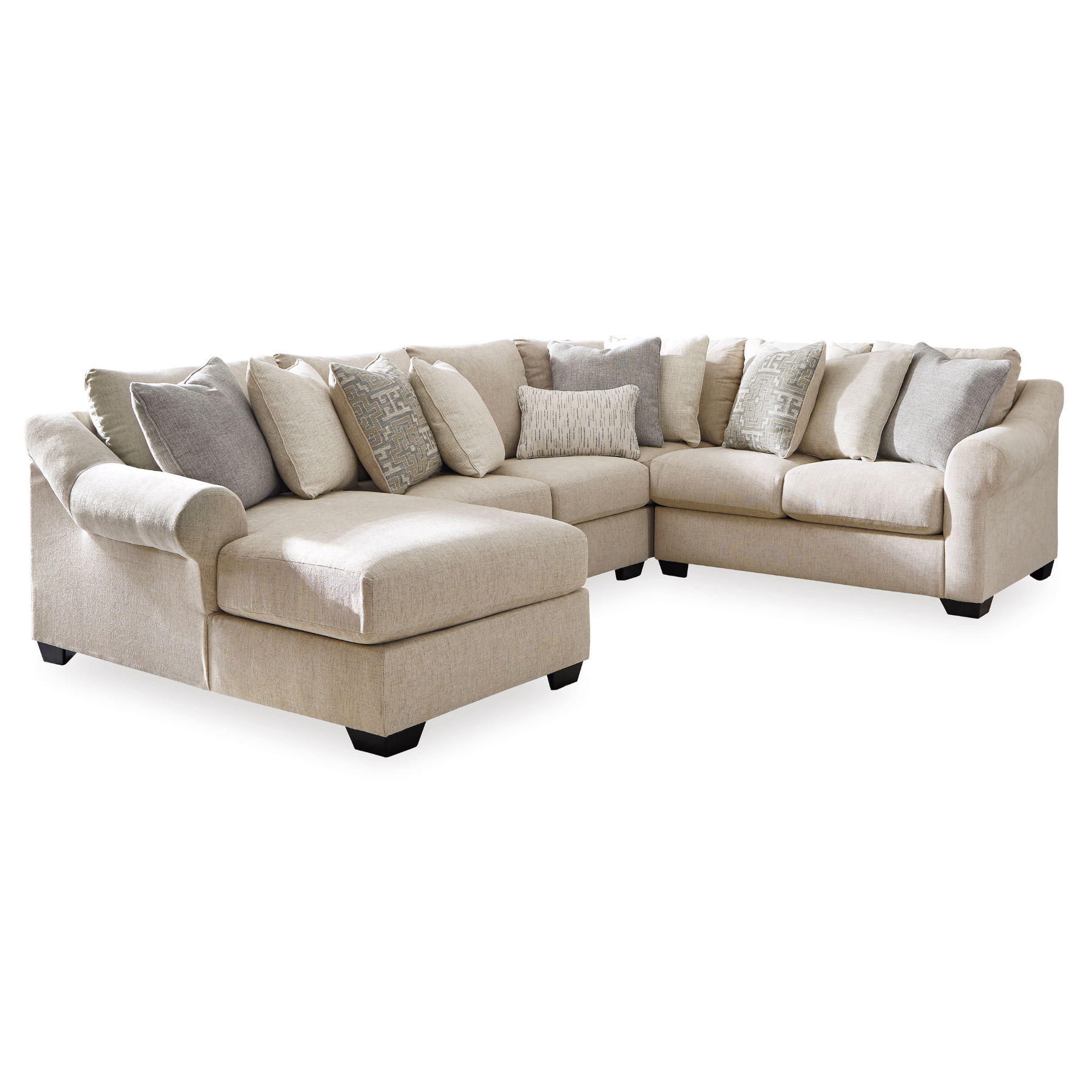 تتضمن 4 قطع: كرسي استرخاء زاوي مواجه للذراع الأيسر، وكنبة بدون أذرع، وكنبة مواجهة للذراع الأيمن؛ "الذراع الأيسر" و"الذراع الأيمن" يصفان موضع الذراع عندما تواجه القطعة؛ إطار محظور بالزوايا؛ وسائد فضفاضة؛ وسائد إسفنجية عالية المرونة ملفوفة بألياف بوليستر سميكة؛ تنجيد من البوليستر؛ وسائد متضمنة؛ وسائد بحشو بوليستر ناعم؛ أقدام مكشوفة بلمسة نهائية من الخشب الصناعي؛ نظام قاعدة المنصة يقاوم الترهل 3 مرات أفضل من نظام الزنبرك بعد 20000 دورة اختبار من خلال توفير دعم أكثر توازناً؛ يحافظ أساس المنصة الأملس على مظهر محكم وخالٍ من التجاعيد بدون انخفاضات أو ترهلات يمكن أن تحدث بمرور الوقت مع أسس زنبركية متعرجة