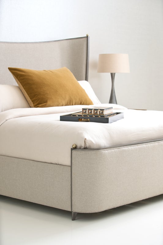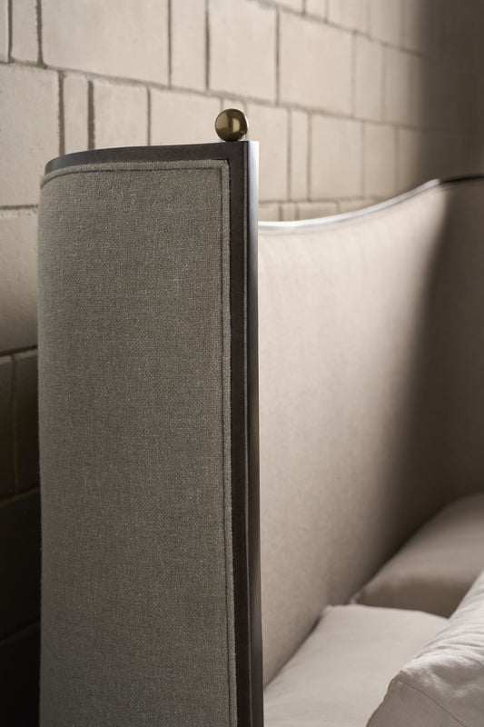 A contemporary take on French traditionalism, this beautifully upholstered bed recalls the exquisite metalwork of wrought iron furniture found in patio gardens. Features an exposed wood frame with tapered metal legs in Craftsman Bronze Paint, accentuated by decorative balls and a warm, gray fabric with the look and feel of luxurious Belgian linen. Pairs perfectly with our Toulouse bench for an evocative yet elegant finish.