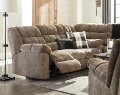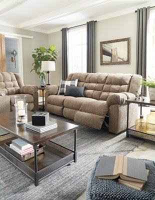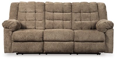 Saddle up for affordably priced luxury with the Workhorse reclining sofa. Stylish elements of this contemporary reclining sofa include biscuit back cushioning and incredibly thick and sumptuous pillow top armrests. Ultra neutral and wonderfully plush, the warm taupe upholstery is sure to complement an endless array of color schemes. Discreetly placed (inside arm) reclining tab maintains streamlined style.