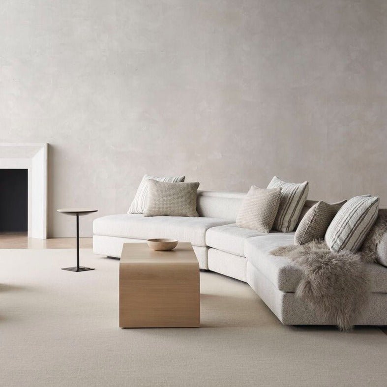 تتميز هذه الطاولة الجانبية بتصميمها البسيط الأنيق الذي يبعث على الشعور بالهدوء والانسيابية العضوية. صُنعت من خشب البلوط المشمس، وتتدلى قمتها الواسعة بأناقة على الجانبين. تتميز الأرجل شبه الدائرية بلمسة نهائية من الطوب اللبن لمزيد من الجاذبية والتباين الدقيق. يمكنك تنسيقها في أزواج لخلق الحركة وتلطيف الخطوط العصرية النظيفة.