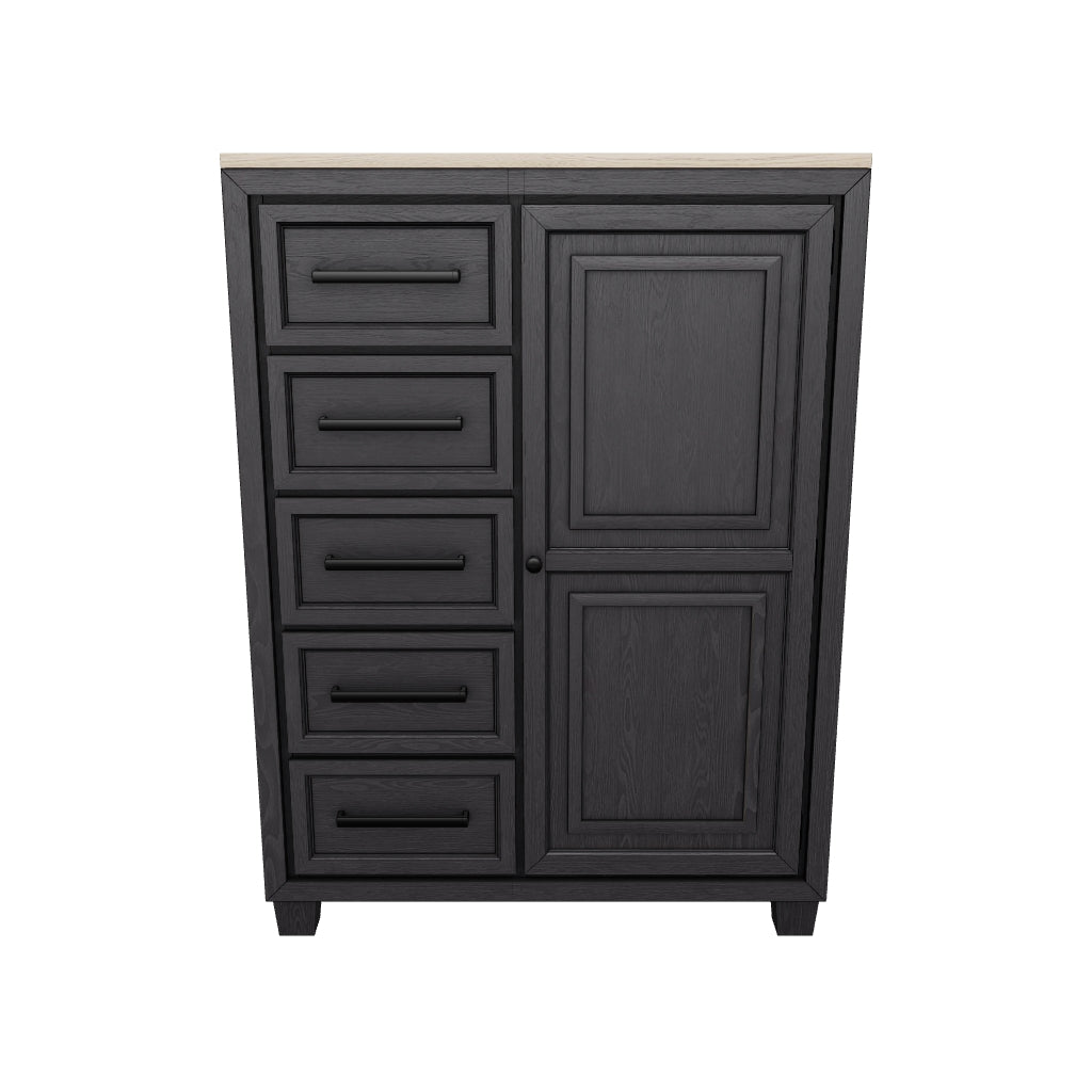خزانة الباب فويلاند هي خزانة عصرية غير رسمية تم تصميمها ببساطة. يتميز مخطط الألوان ثنائي اللون باللون الأسود الغامق المصقول مع لمسة من لون الخشب البني الرمادي الجميل. وهناك الكثير من التخزين لتلبية احتياجات خزانة ملابسك بسهولة. تحتوي الخزانة على 5 أدراج ناعمة الإغلاق، وخلف الباب ستجد صواني قابلة للسحب للأحذية أو الملحقات الأخرى، بالإضافة إلى أرفف للأشياء الضخمة.