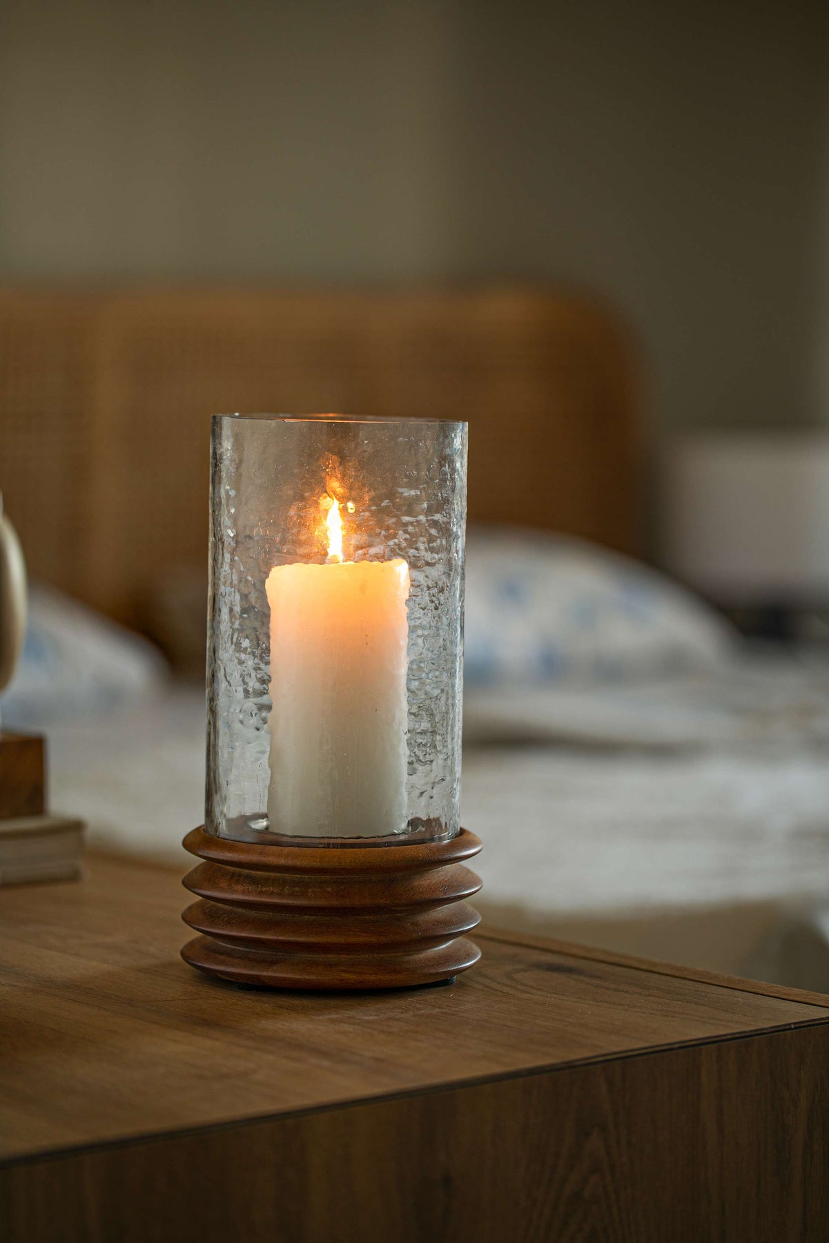 حامل شموع زجاجي وخشبي