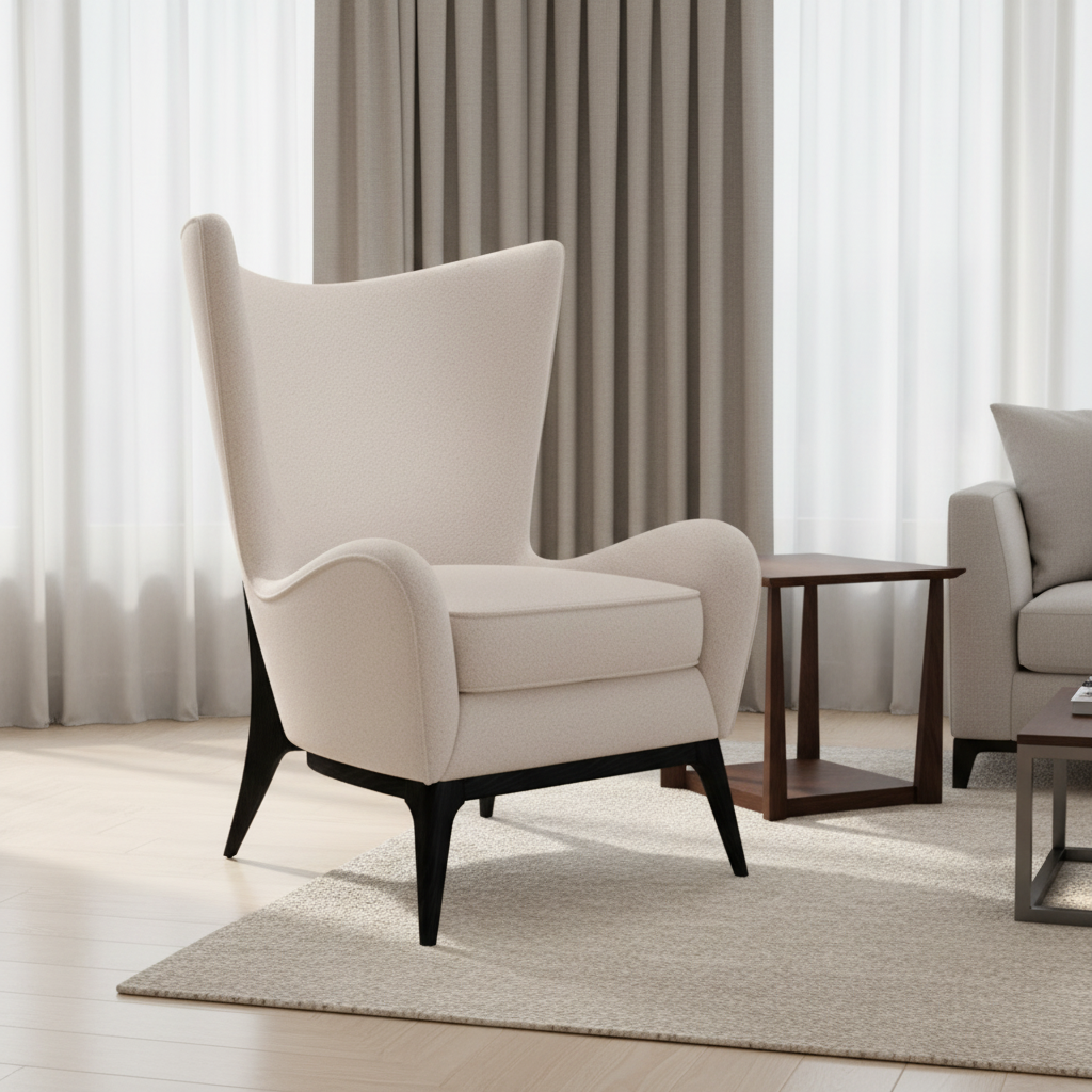 يجسد هذا الكرسي المجنح الفريد من نوعه الطراز الاسكندنافي حقًا من خلال عنصر التفاصيل الخشبية عبر الجزء الخلفي من خشب الجوز الحديث. تحتضنك ذراعيه المنحدرة بأناقة وظهره المستدير الناعم لراحة دافئة بأناقة، بما يتماشى أيضًا مع السمات الاسكندنافية الأصيلة.