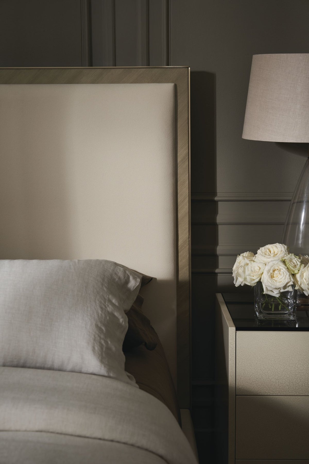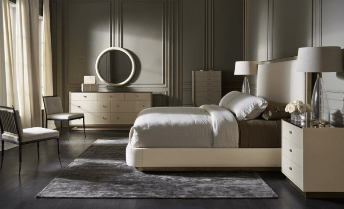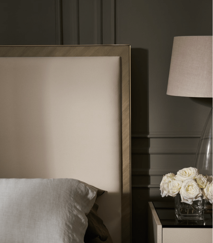 يقدم هذا السرير الكلاسيكي، الذي يجمع بين الخامات والأشكال، لوحة ألوان محايدة هادئة ودافئة وجذابة. محاط بقشرة كوتو بنمط شيفرون دقيق مستوحى من الزخارف اليونانية المبكرة، ومسند الرأس على طراز بارسونز مزين بقماش من الفلانيل يشبه الصوف ناعم ومتين ومغطى على جميع الجوانب الثلاثة بمعدن ذهبي مصقول لامع. يبدو وكأنه يطفو على قاعدة من الذهب المصقول، ويضفي شكله المتطور أناقة سهلة على ديكورات غرف النوم وأجنحة الضيوف. متوفر أيضًا بأجنحة مسند رأس مقسمة بنمط شيفرون لمزيد من الدراما.
