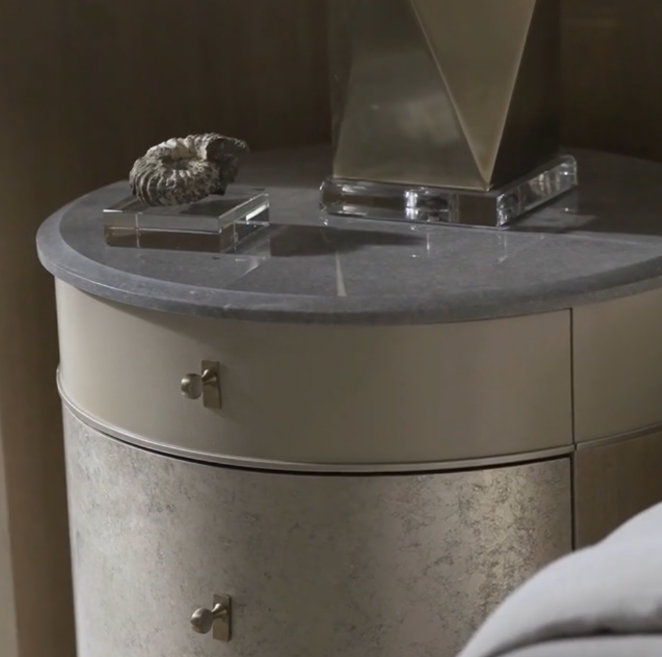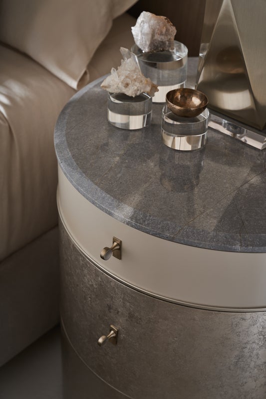 صُممت طاولة السرير Hang Around لتتلاءم بشكل مثالي مع أجنحة سرير Dream Chaser، أو لتضفي لمسة آسرة بمفردها، وهي تقدم مزيجًا راقيًا من المواد واللمسات النهائية. يتميز شكلها المنحني الأنيق بدرج علوي نحيف بلمسة نهائية سحابية مهدئة ودرجين سفليين بأوراق معدنية مكسورة تذكرنا بلمعان نافذة مغطاة بالصقيع ومضاءة بالشموع. مغطاة بـ Dry Martini لتسليط الضوء على الجمال الطبيعي لخشب الكوتو.