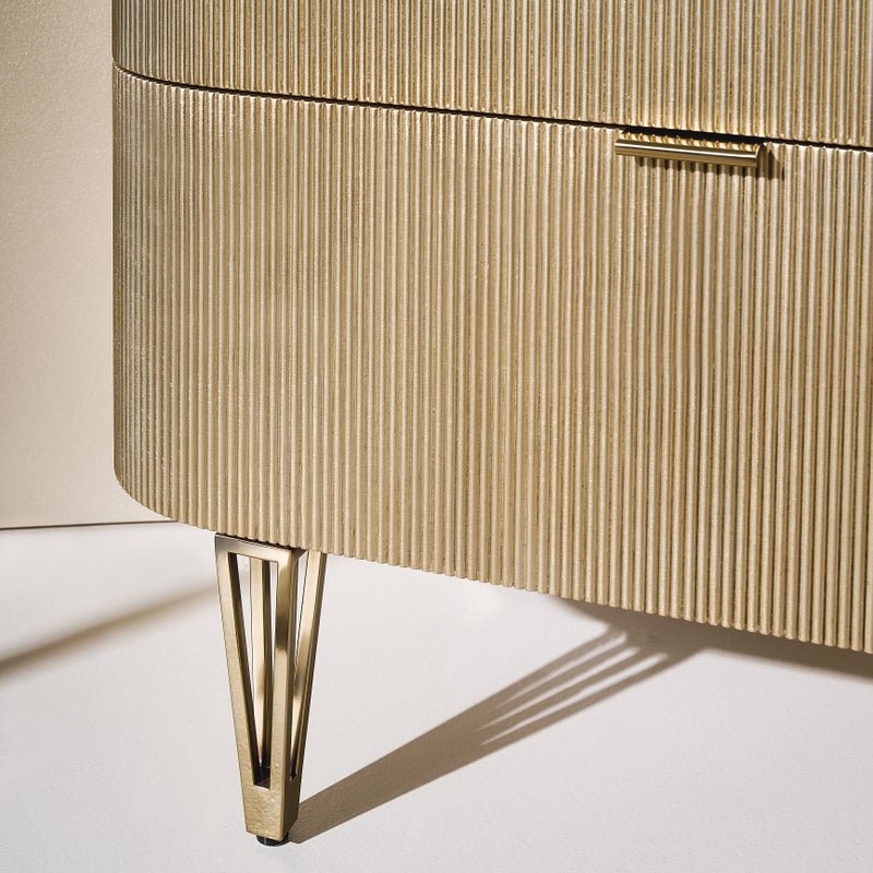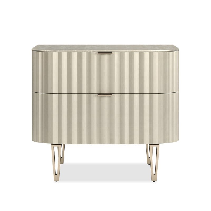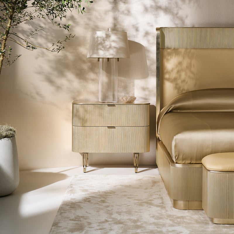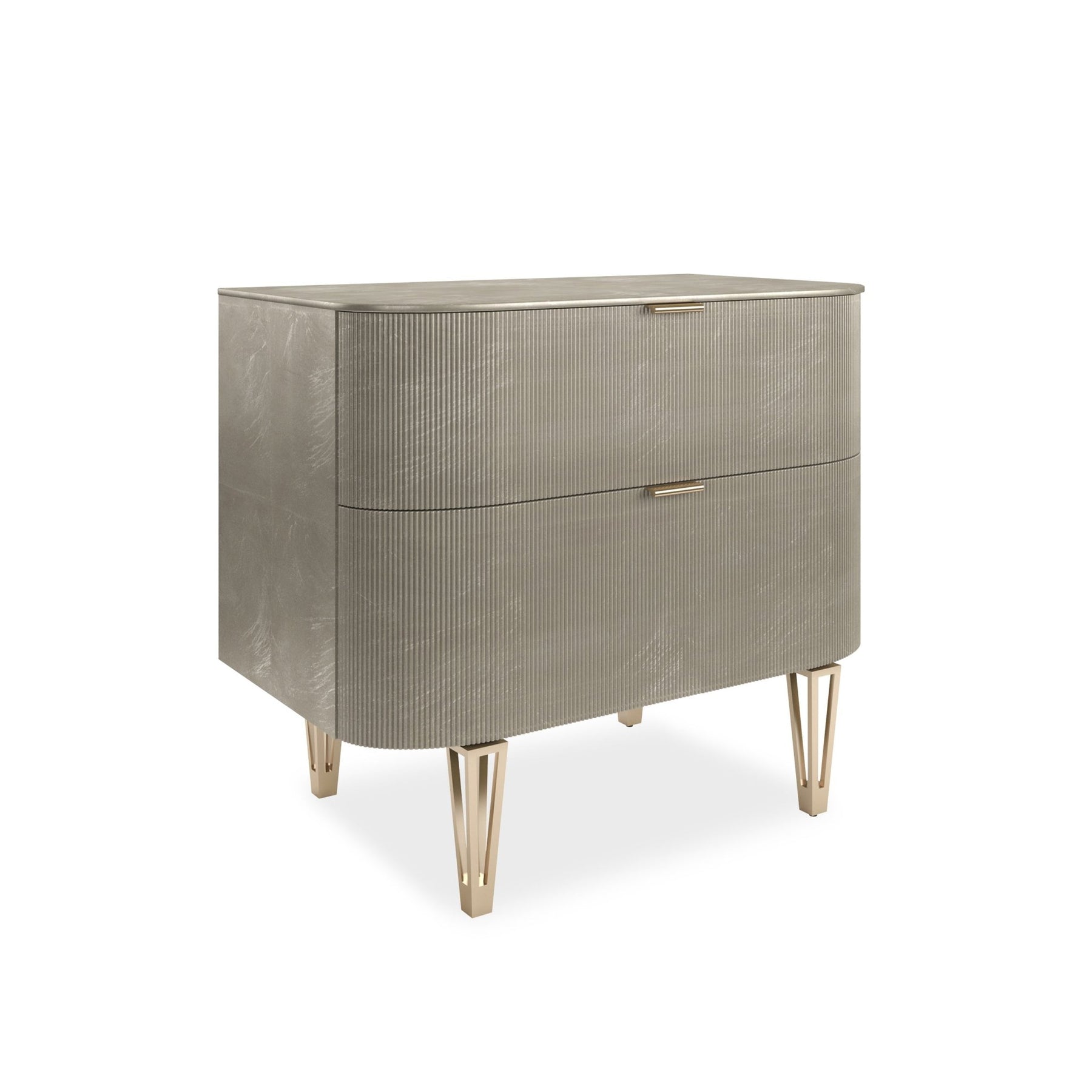 تبرز أوراق Oracle Silver Leaf وWhisper of Gold شكلها الدائري وأسطحها المزخرفة. تضيف الأرجل المعدنية المدببة اللامعة لهذه الطاولة الليلية لمسة نهائية لا تُنسى.