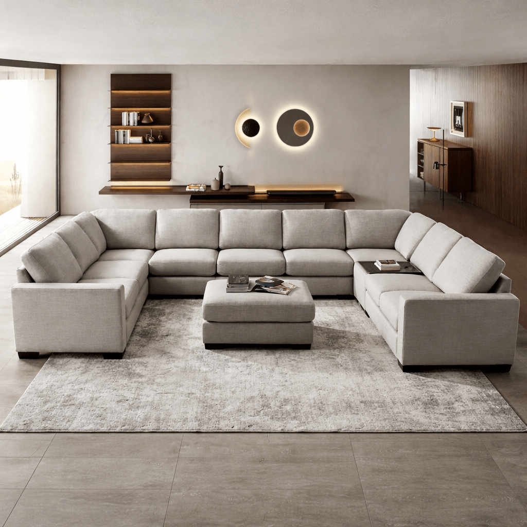 أقسام حديثة ومقسمة تم تصميمها بشكل فريد لتتمكن من تحريكها وتحسينها لتناسب احتياجات منزلك. تؤسس هذه الأقسام أرضية جديدة من المرونة والأناقة لتناسب مكانك تمامًا. يمكنك ترتيب ومزج قطع الأقسام بشكل إبداعي لمناسبات مختلفة. إنها تحقق التوازن المثالي بين التصميم الحديث والبسيط لتوفير راحة تشبه السحاب.
