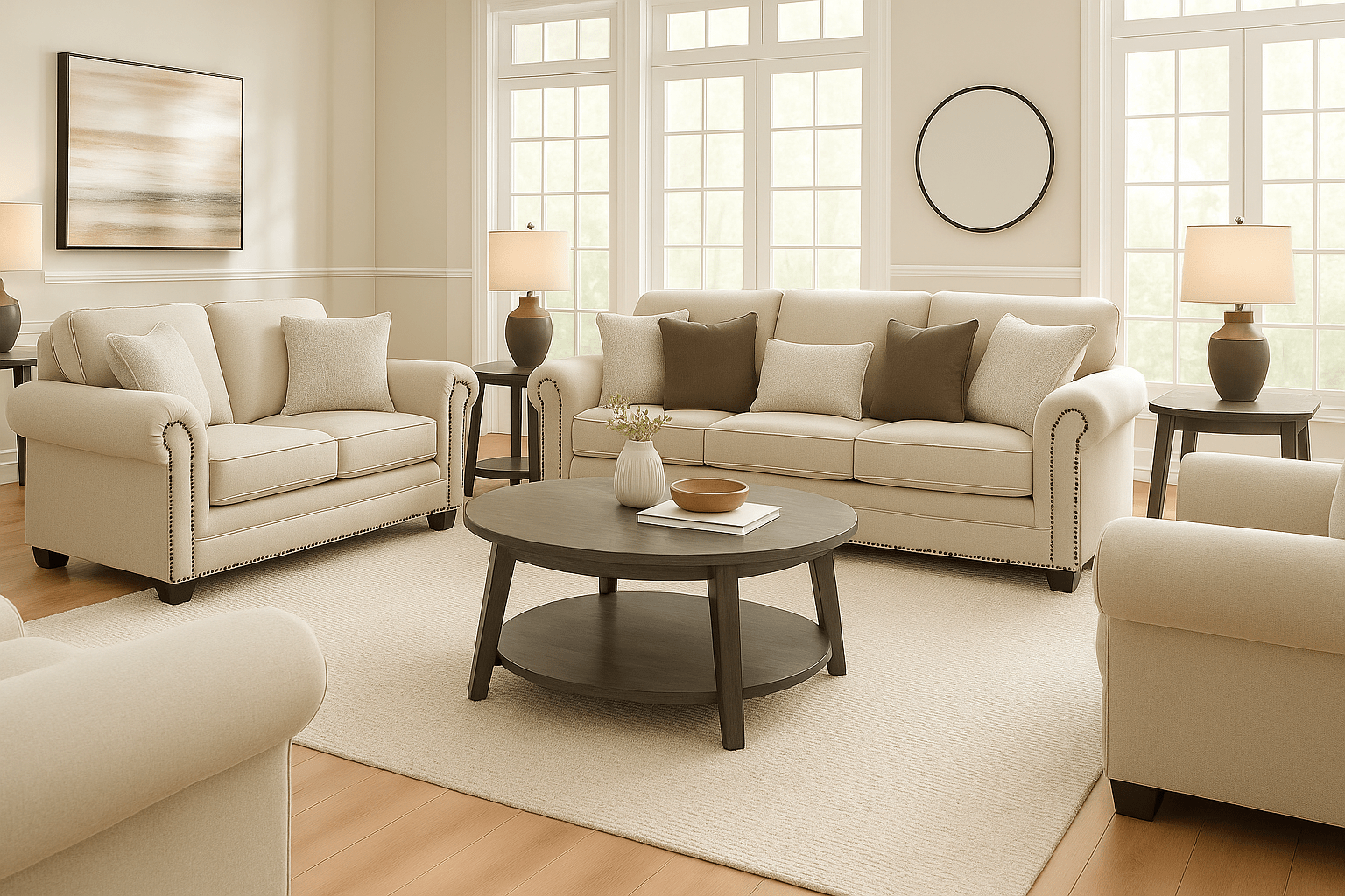 Round out your seating area with the Caitbrook coffee table set in a contemporary two-tiered round design. Clean-lined design is simple, yet striking—while its antiqued gray washed finish over Acacia wood and veneer is anything but ordinary.