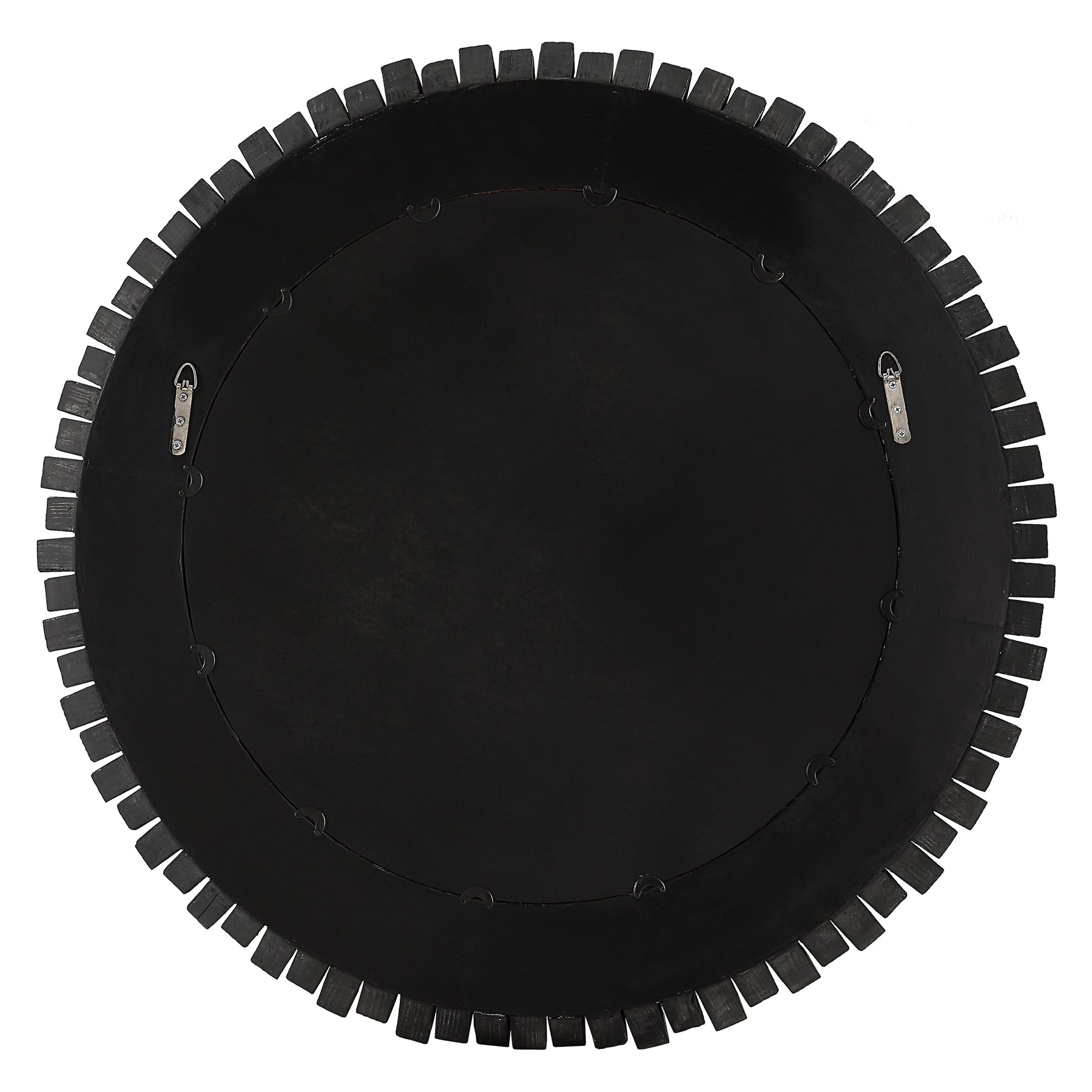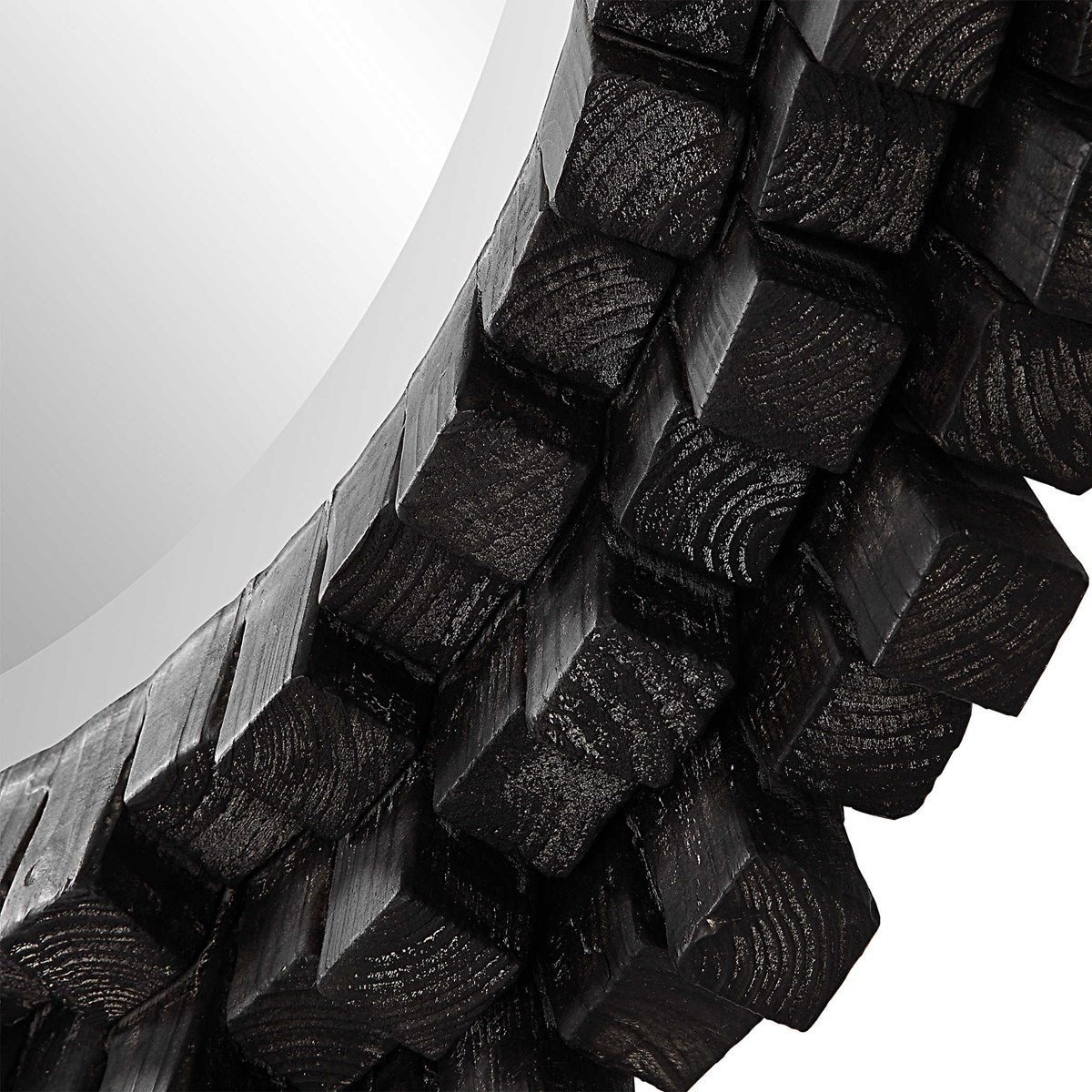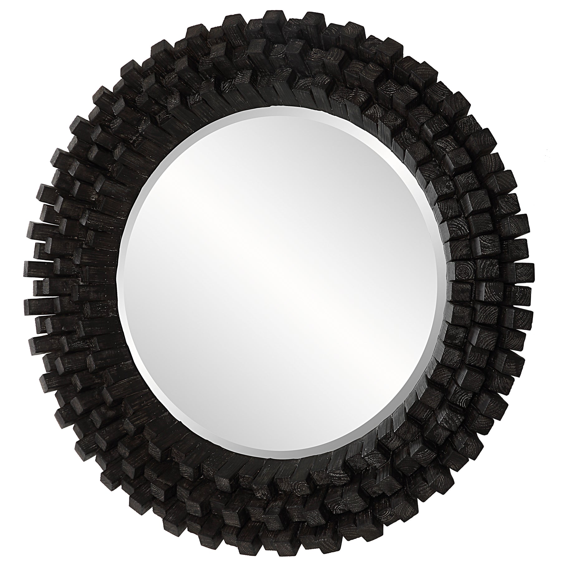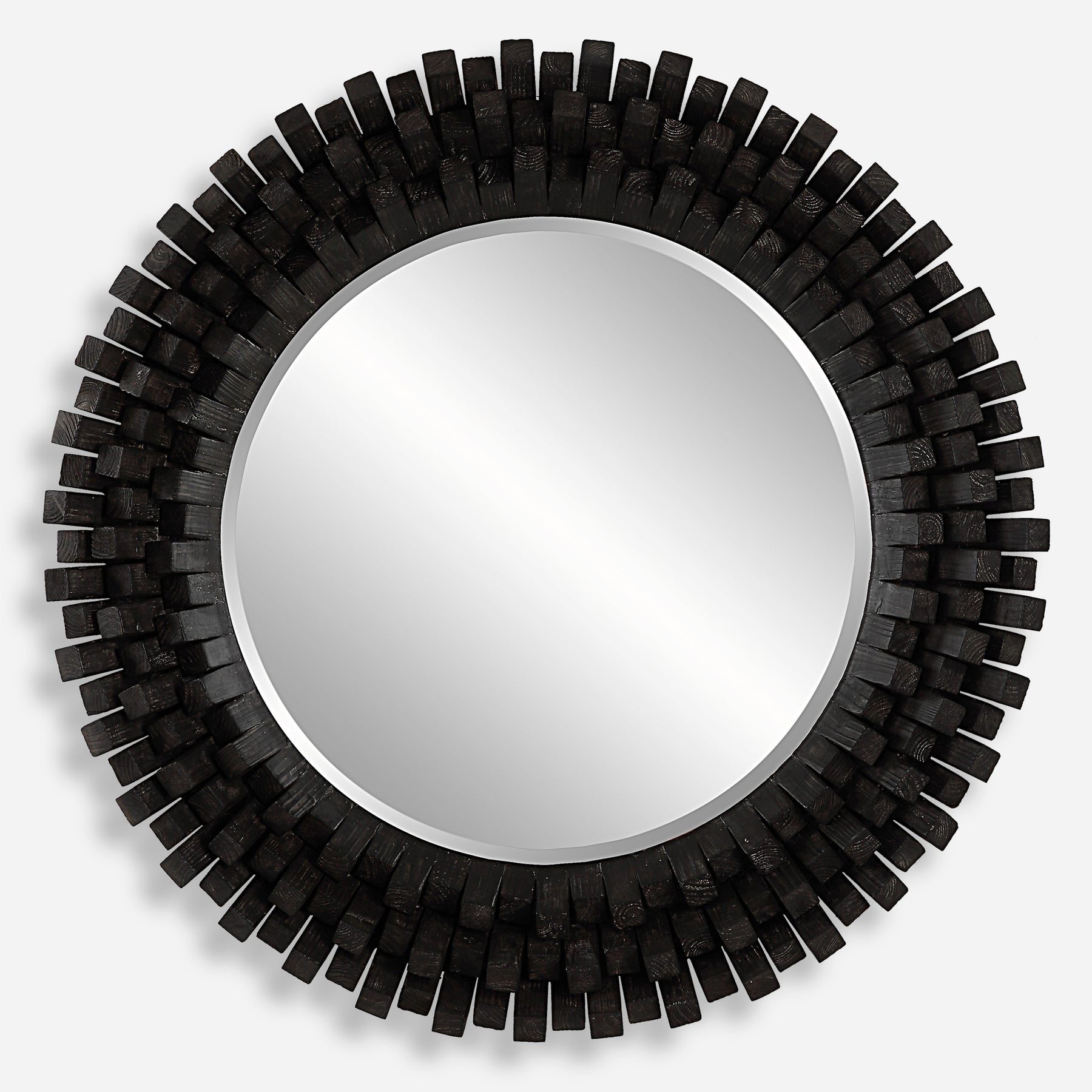 تتميز هذه المرآة الخشبية الدائرية بلمسة ريفية معاصرة من خلال أعمدة مائلة من الخشب الصلب مكدسة في ارتفاعات متناوبة لعرض درامي وفريد من نوعه، ومطلية باللون الأبنوس مع غسول رمادي رقيق. تتميز المرآة بحافة مائلة سخية مقاس 1 1/4 بوصة.