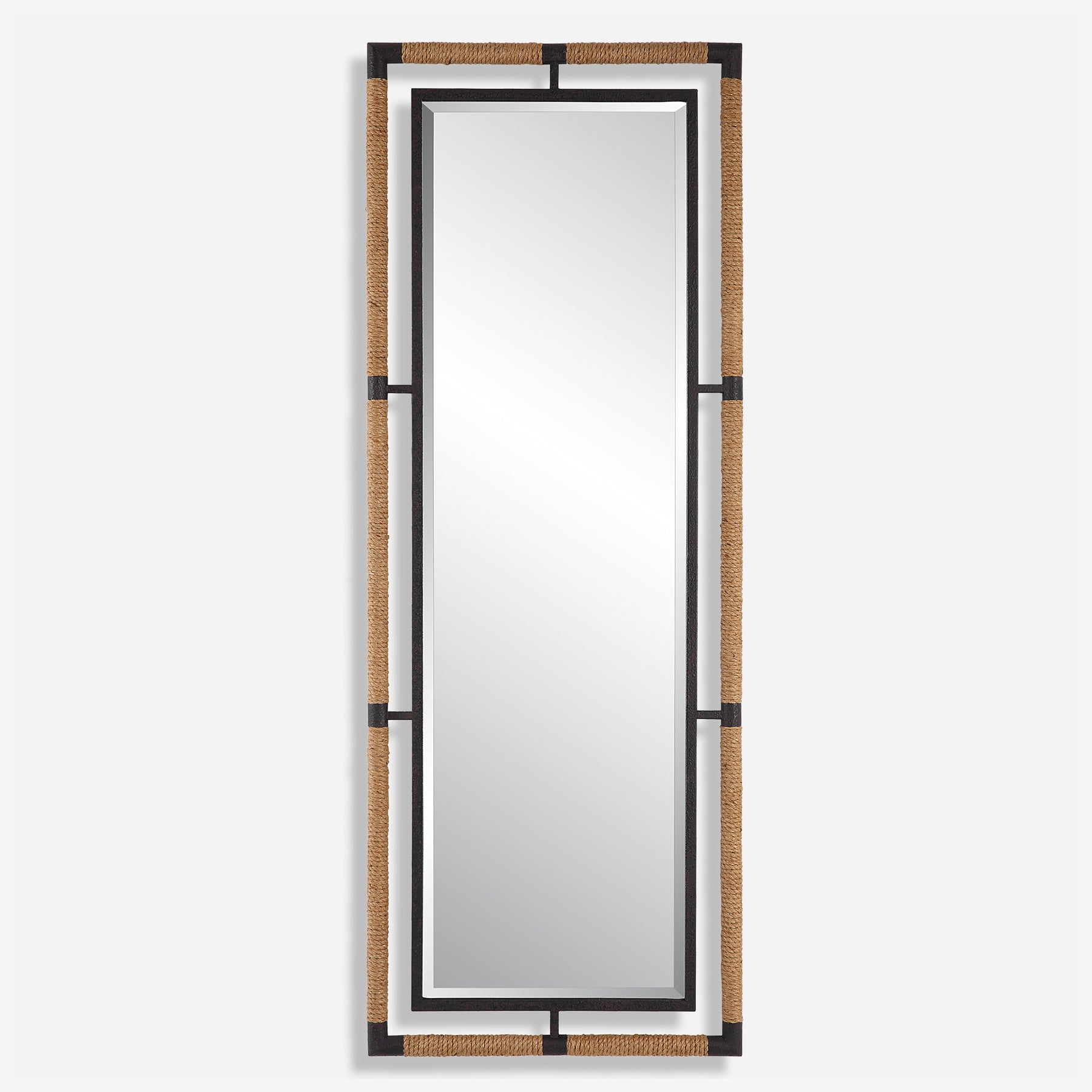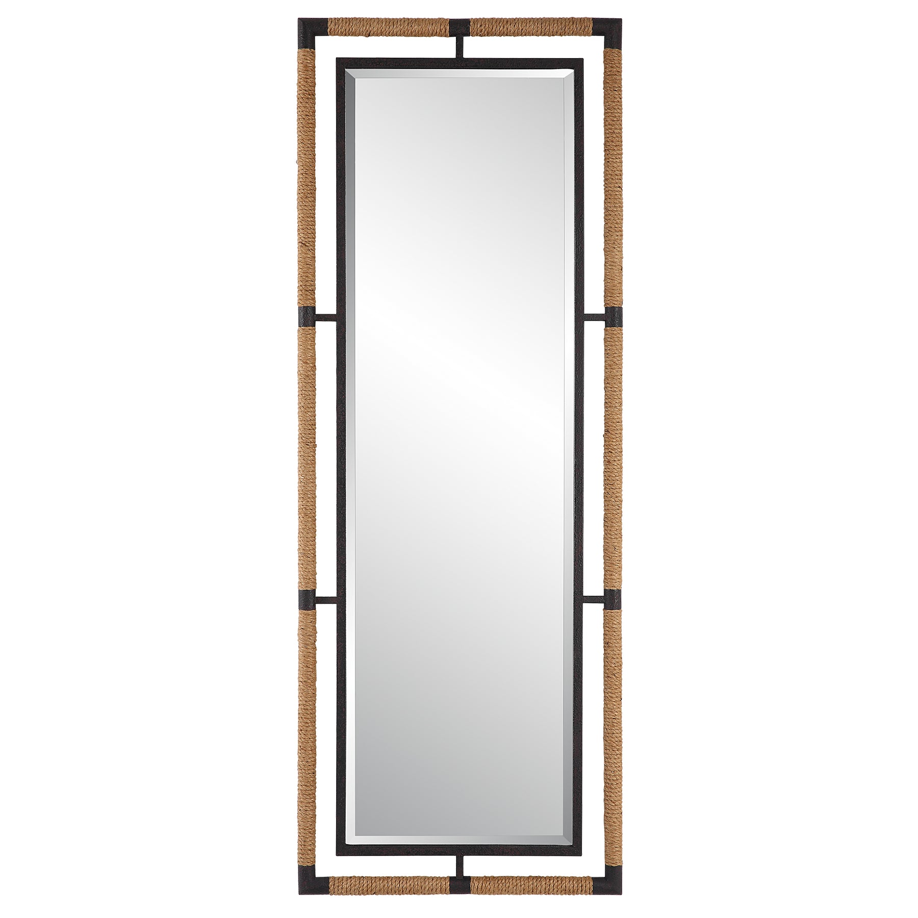 إطار المرآة المصنوع من الحديد المطاوع هذا مطلي باللون الأسود الصدئ المزخرف المغلف بحبل طبيعي مما يضفي إحساسًا ساحليًا على أي غرفة. المرآة محاطة بحافة كبيرة مقاس 1 1/4 بوصة. يمكن تعليقها أفقيًا أو رأسيًا.