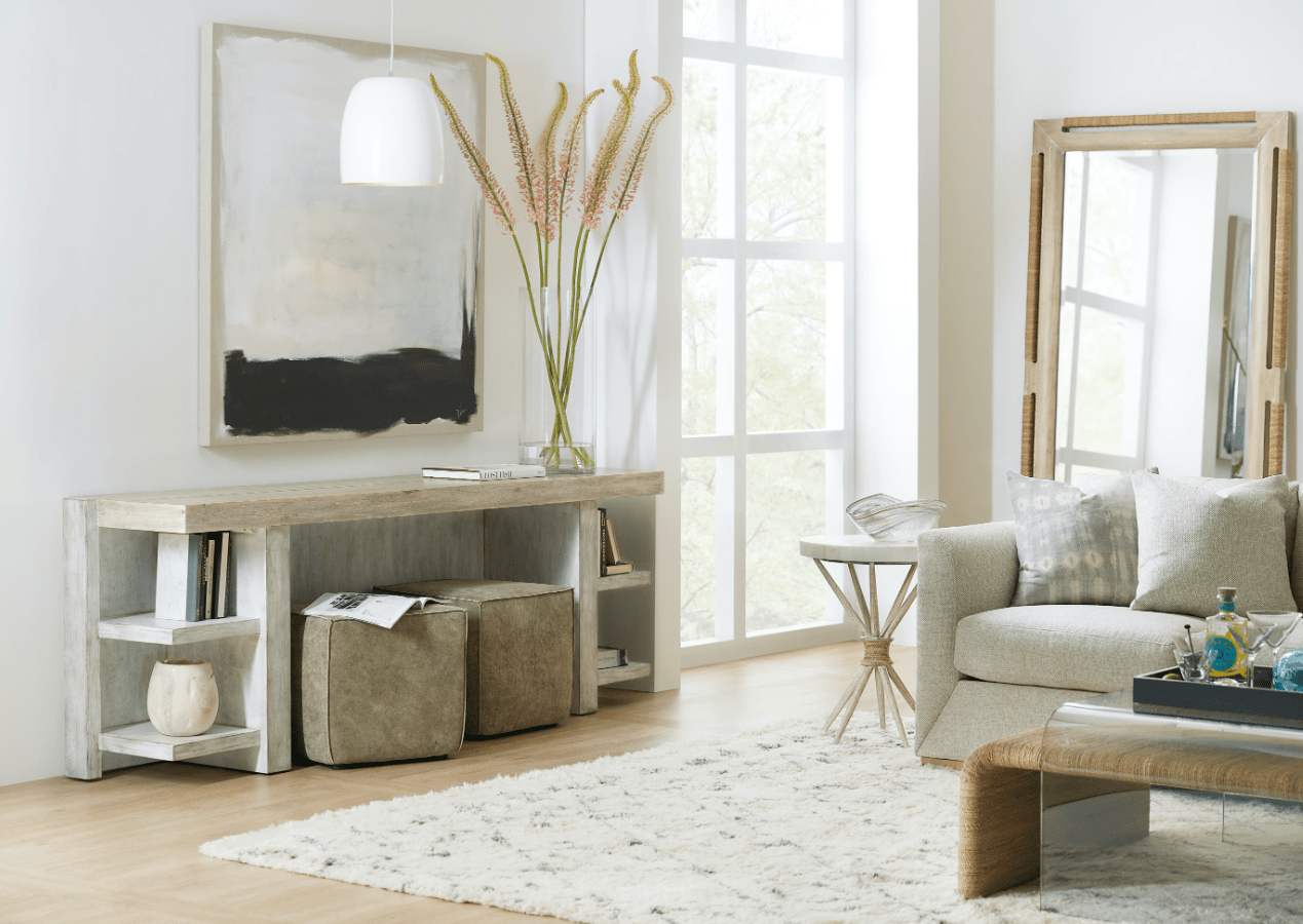 تتميز طاولة الكونسول أماني بتصميم عصري غير رسمي مع مزيج هادئ من المواد العضوية في لوحة ألوان محايدة مهدئة، حيث تتباين اللمسة البيضاء المتآكلة على القاعدة مع اللمسة النهائية المزخرفة باللون اللوزي الفاتح على السطح. مصنوعة من قشرة البقان، تحتوي طاولة الكونسول على رفين ثابتين على كل جانب ومنطقة مركزية مثالية لوضع الوسائد أو أي شيء آخر.
