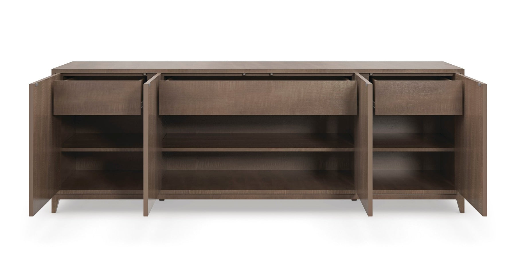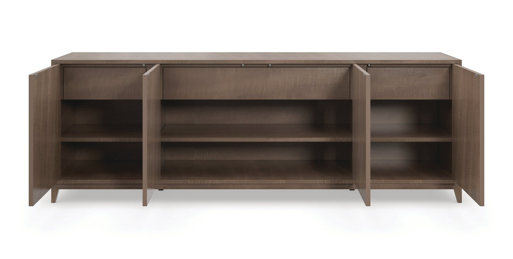 يلفت مظهر الموكا الغني الانتباه إلى قشور القيقب النمرية الأنيقة بنمط نجمي مشع. تتميز هذه الخزانة ذات الحجم الكبير بأربعة أدراج داخلية وثلاثة أرفف قابلة للتعديل خلف أبواب تعمل باللمس للحصول على خيار تخزين أنيق مع إمكانات لا حصر لها للأناقة. يترك انطباعًا أوليًا مذهلاً في المداخل وغرف المعيشة وغرف الطعام.