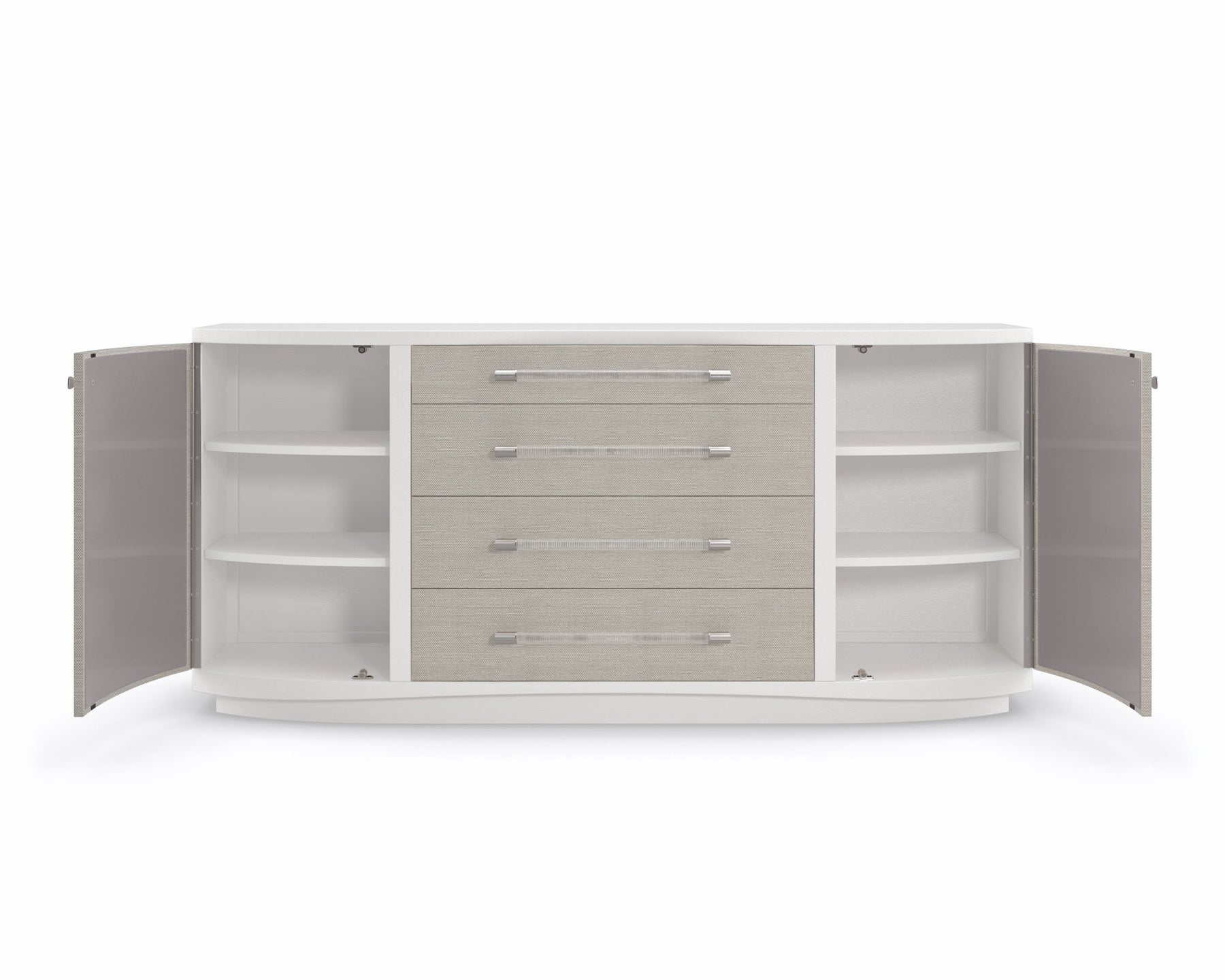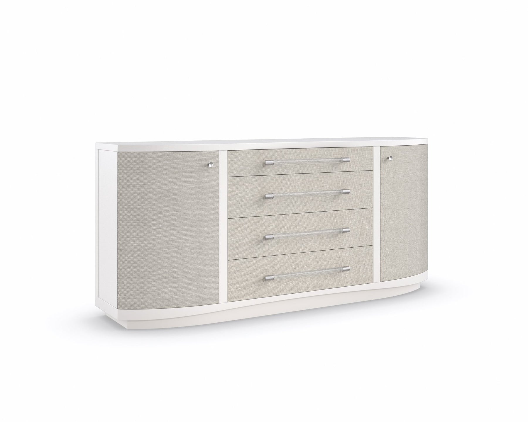 تتميز هذه الخزانة ذات الطابع العضوي المتأصل بعنصر معدني ناعم الملمس للديكورات الداخلية لغرف النوم. تم إعادة تصور الجمال الطبيعي للرافيا المنسوجة باللون الفضي المشمس، مع استكماله بقشرة خشب الدردار بلمسة نهائية بيضاء لؤلؤية. تضفي مقابض الأكريليك المغطاة بالفولاذ المقاوم للصدأ المضلع والمقابض المربعة المنقوشة بنمط أوراق الجنكة لمسة نهائية مميزة. توفر مساحة التخزين السخية أربعة أدراج ورفوف واسعة خلف كل من البابين الطرفيين لتنظيم مبهج من الناحية الجمالية. تسمح الفتحات على طول الظهر بإدارة الحبال والتنوع الوظيفي.