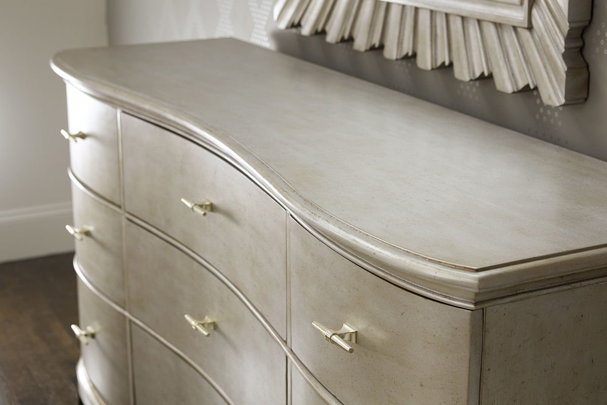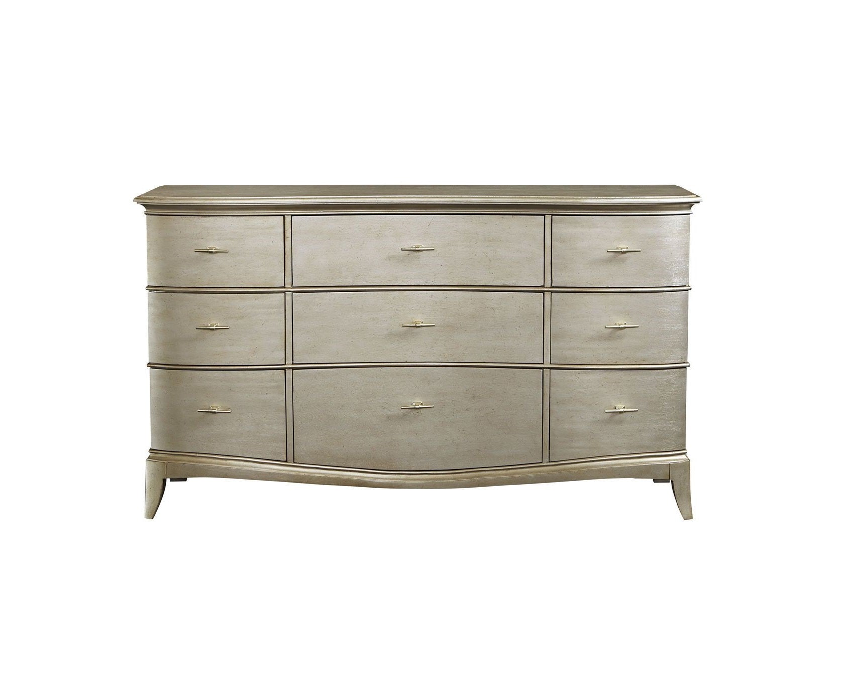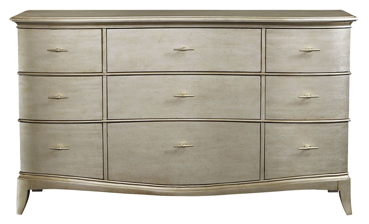 روعة كاملة: تتميز خزانة ستارلايت ذات التسعة أدراج ذات الواجهة الأمامية ذات الشكل الأفعواني بأجزاء أدراج ذهبية اللون تشبه المجوهرات وطبقة نهائية مطلية باللون الفضي تم تلميعها بالصقيل من أجل الدفء والشيخوخة اللطيفة.