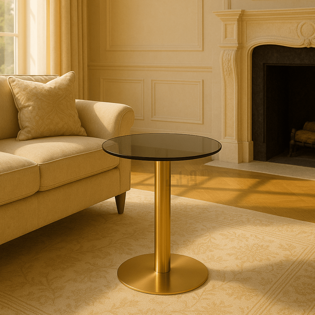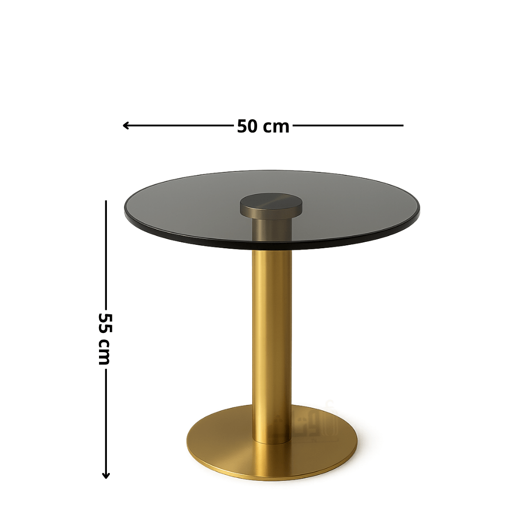 طاولة جانبية دائرية بسطح زجاجي وقاعدة ستانلس ستيل ذهبية فاخرة