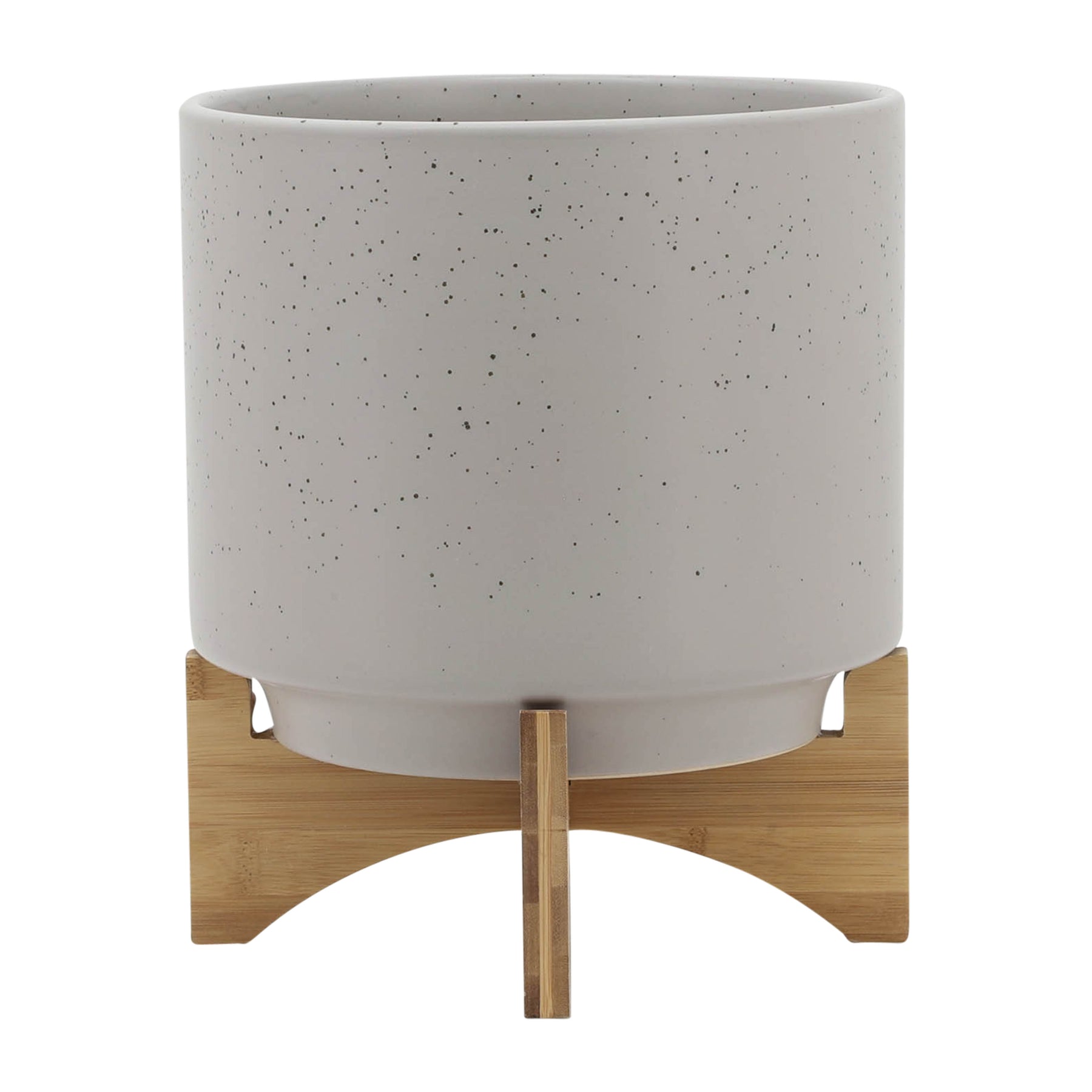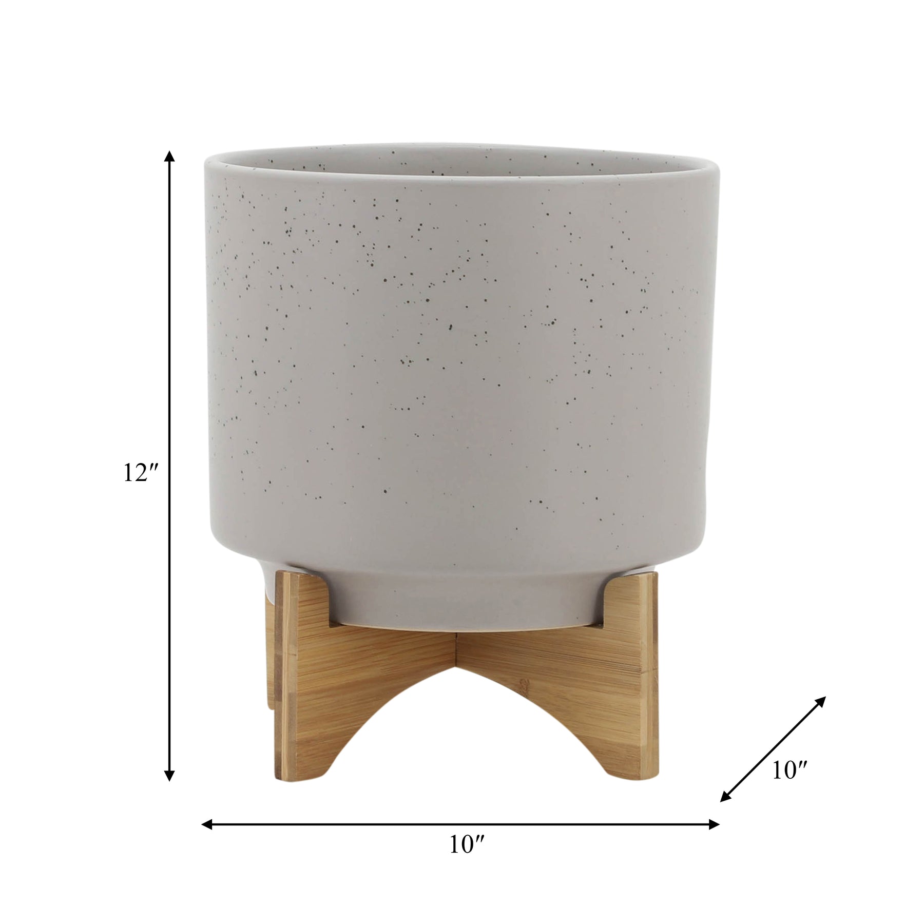 وعاء زرع مقاس 10 بوصات مع حامل خشبي، لون بيج غير لامع