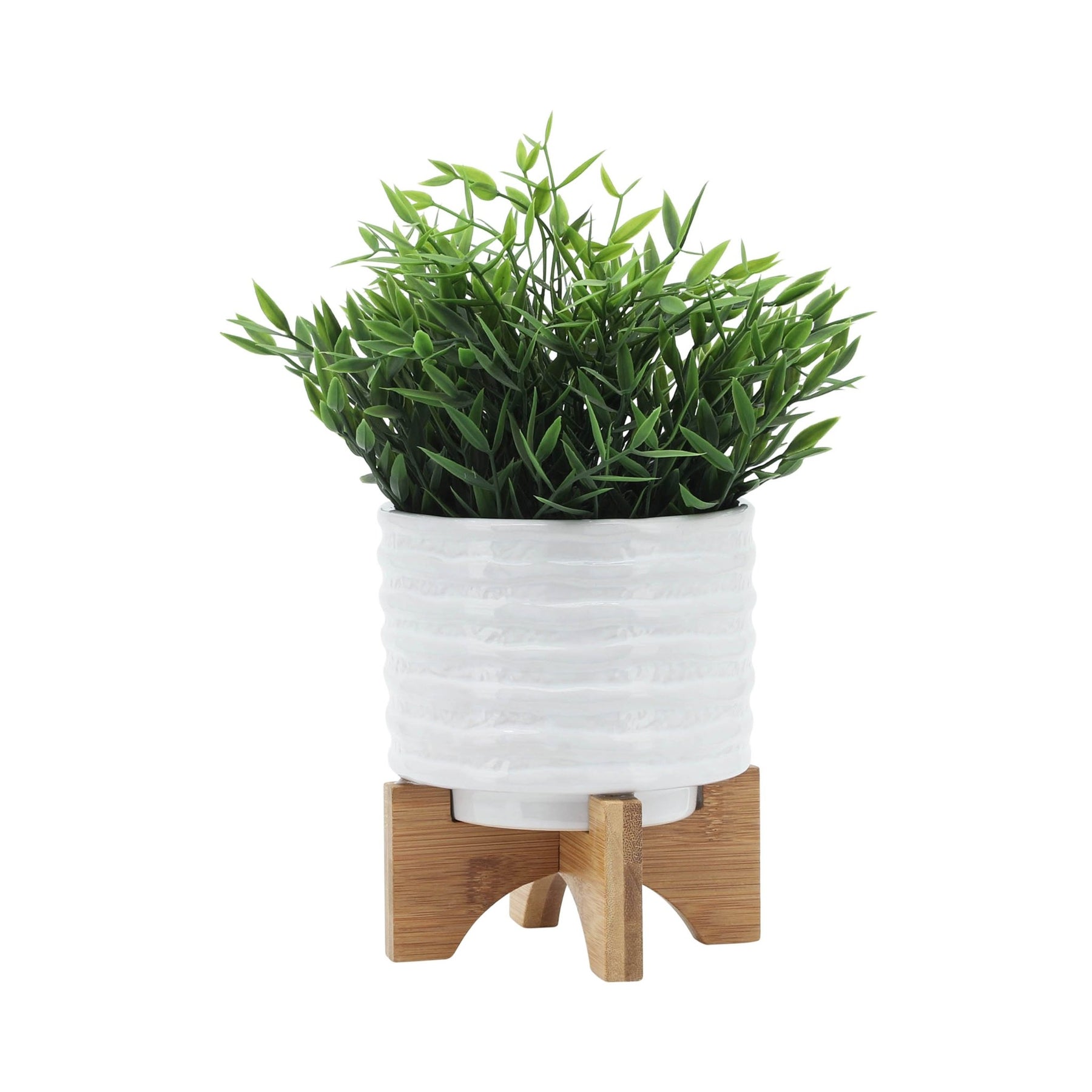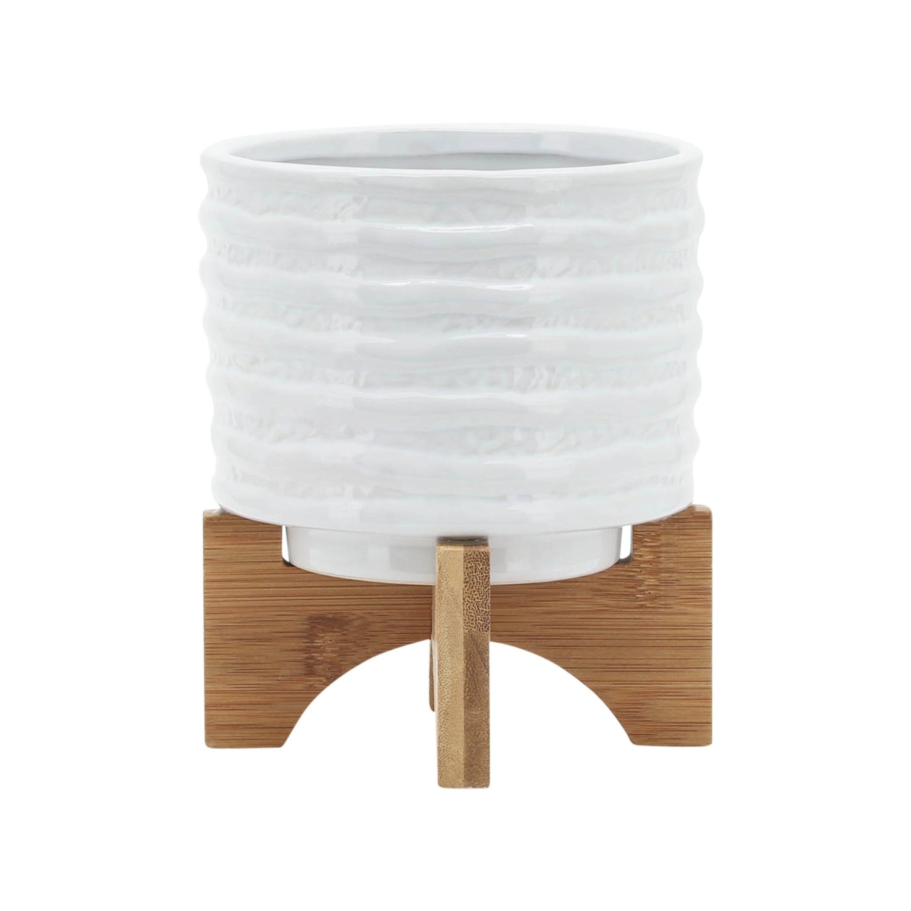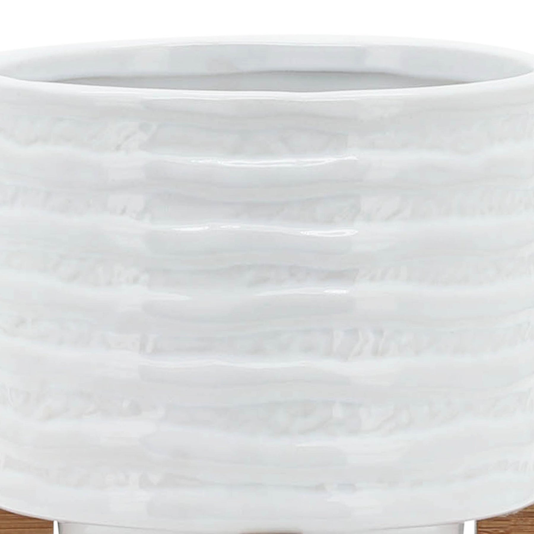 وعاء زهور سيراميك 5" مع قاعدة، بتصميم خطوط بيضاء