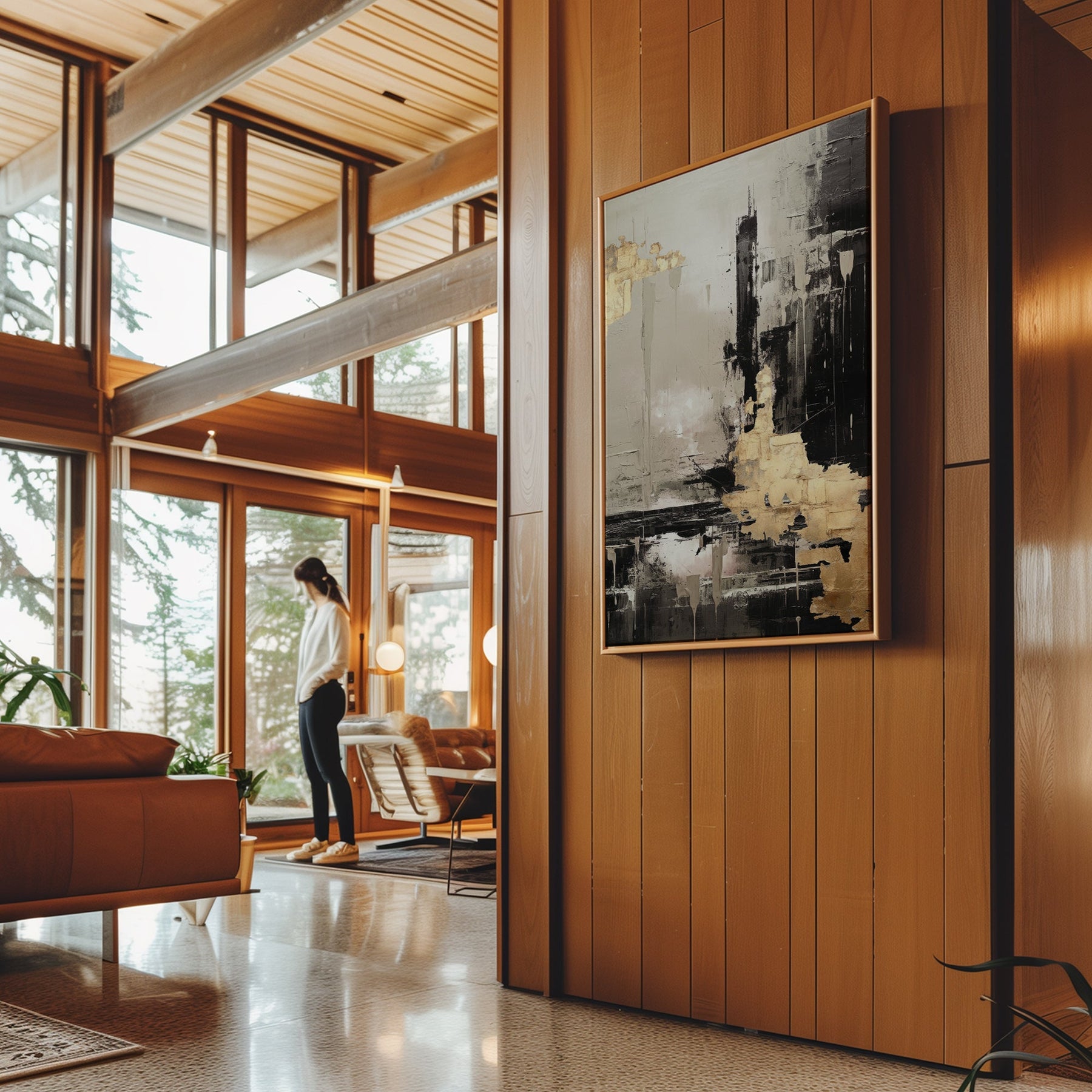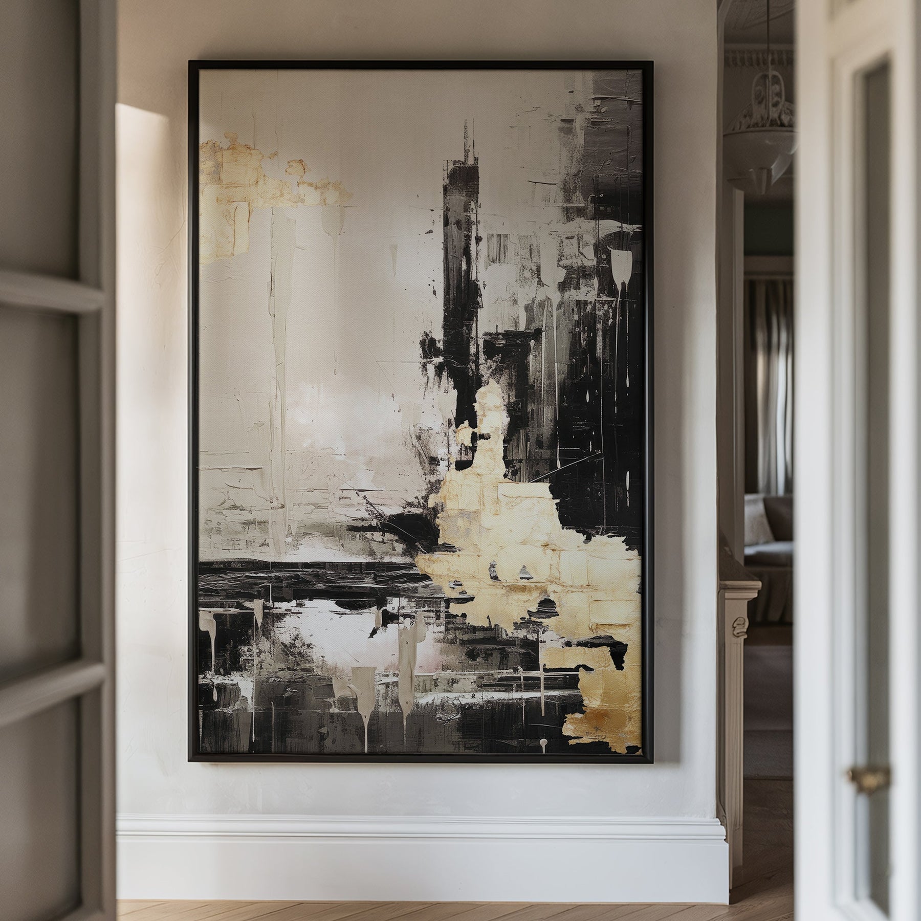 فن الجدران القماشي الممتد على إطار خشبي بنمط أسود وذهبي