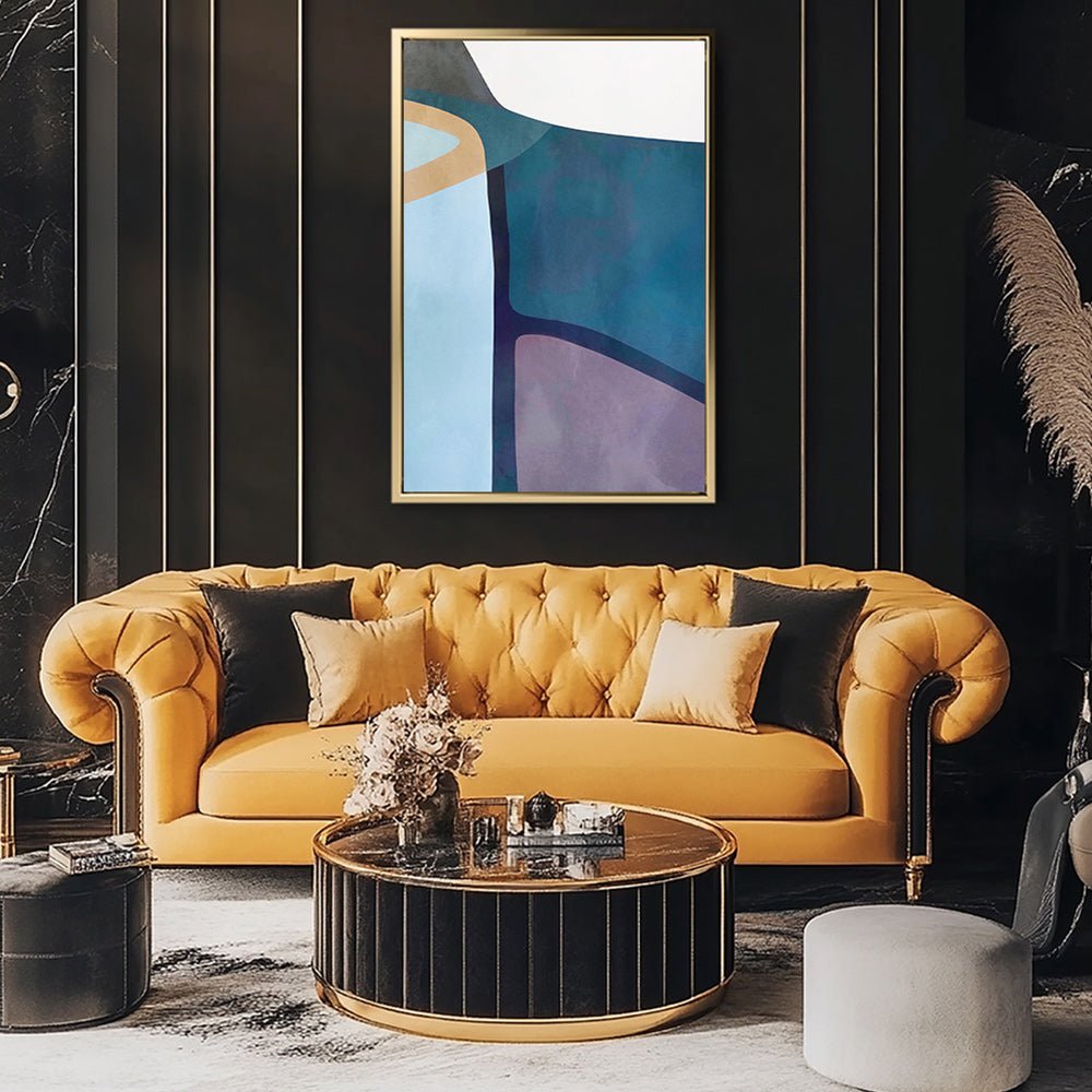 فن جداري قماشي مشدود على إطار خشبي مع إطار عائم ورسم تجريدي بألوان باردة