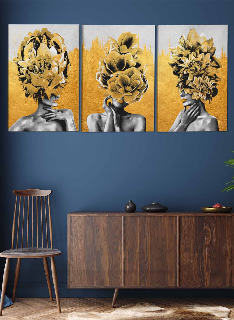 لوحات فنية تجريدية لفتاة مع زهرة على الرأس (مجموعة من 3)