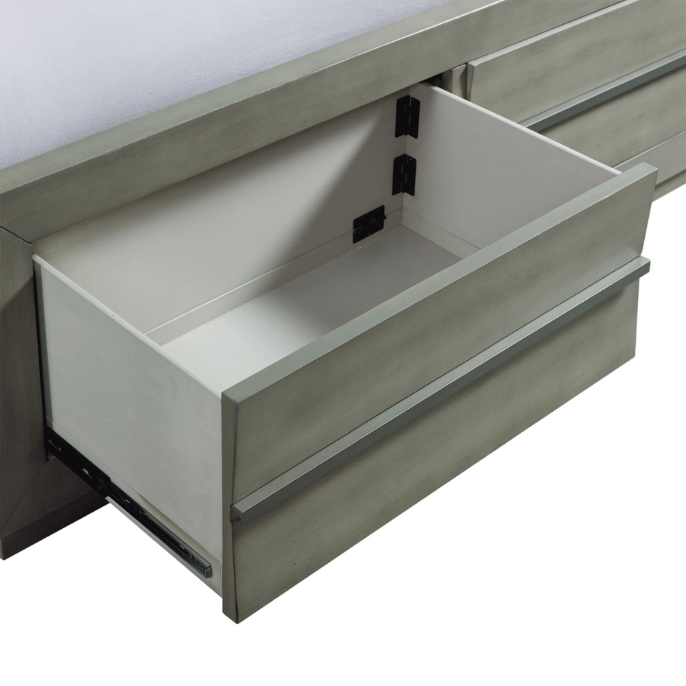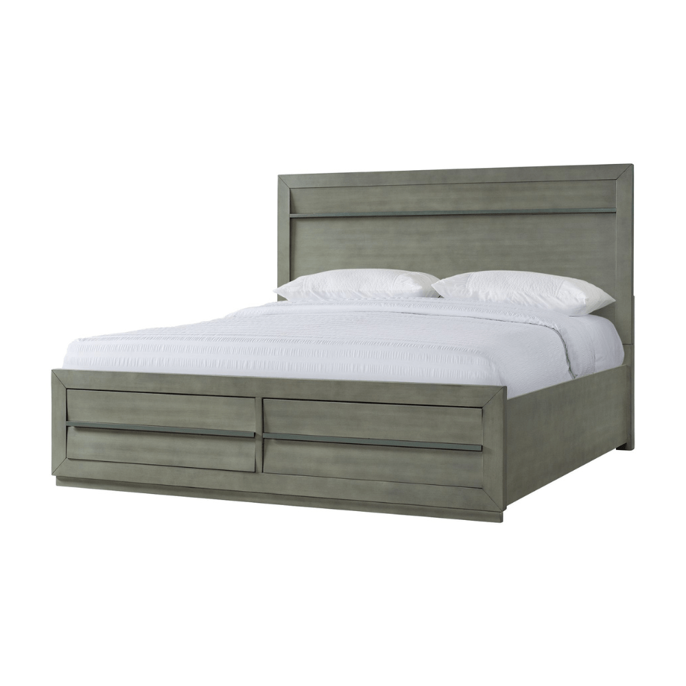 سرير التخزين Zig King عملي وحديث. مصنوع جيدًا من خشب الأكاسيا والأخشاب المصنعة. تم تشطيبه باللون الرمادي الدخاني الذي يتناسب جيدًا مع معظم المنازل المحايدة. يتميز بدرجين للتخزين عند لوح القدم، حيث يمكنك تخزين ملاءاتك وبطانياتك. تتميز أدراج التخزين بمقابض مستطيلة طويلة تضيف مظهرًا مميزًا للسرير. ما نحبه أكثر في هذا السرير هو أنه لا يتطلب زنبركًا. أضف طاولة بجانب السرير وصندوق Zig للحصول على مظهر مكتمل!
