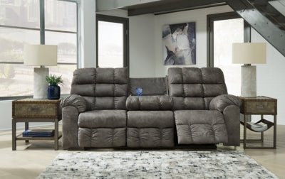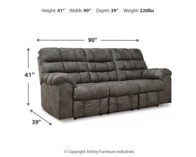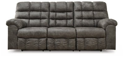 Rock the cool look of leather minus the hefty price tag with the Derwin dual reclining sofa. Rich with tonal variation, the faux leather upholstery sure looks like the real thing. And talk about indulgent comfort. Double stuffed armrests and sumptuous cushions cradle and support in all the right places. A distinctive biscuit back design enhances this sofa's contemporary flair. The center console and handy cup holders complete the experience.
