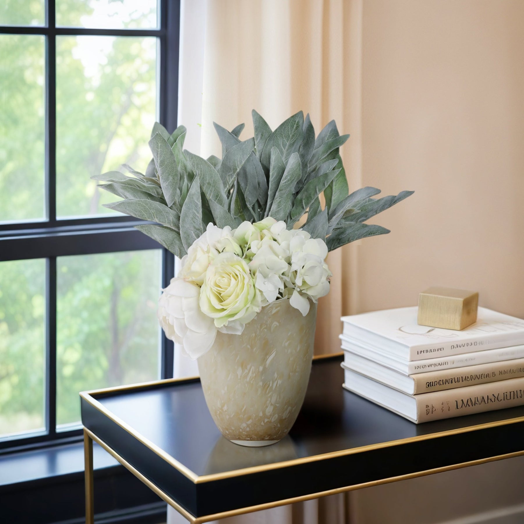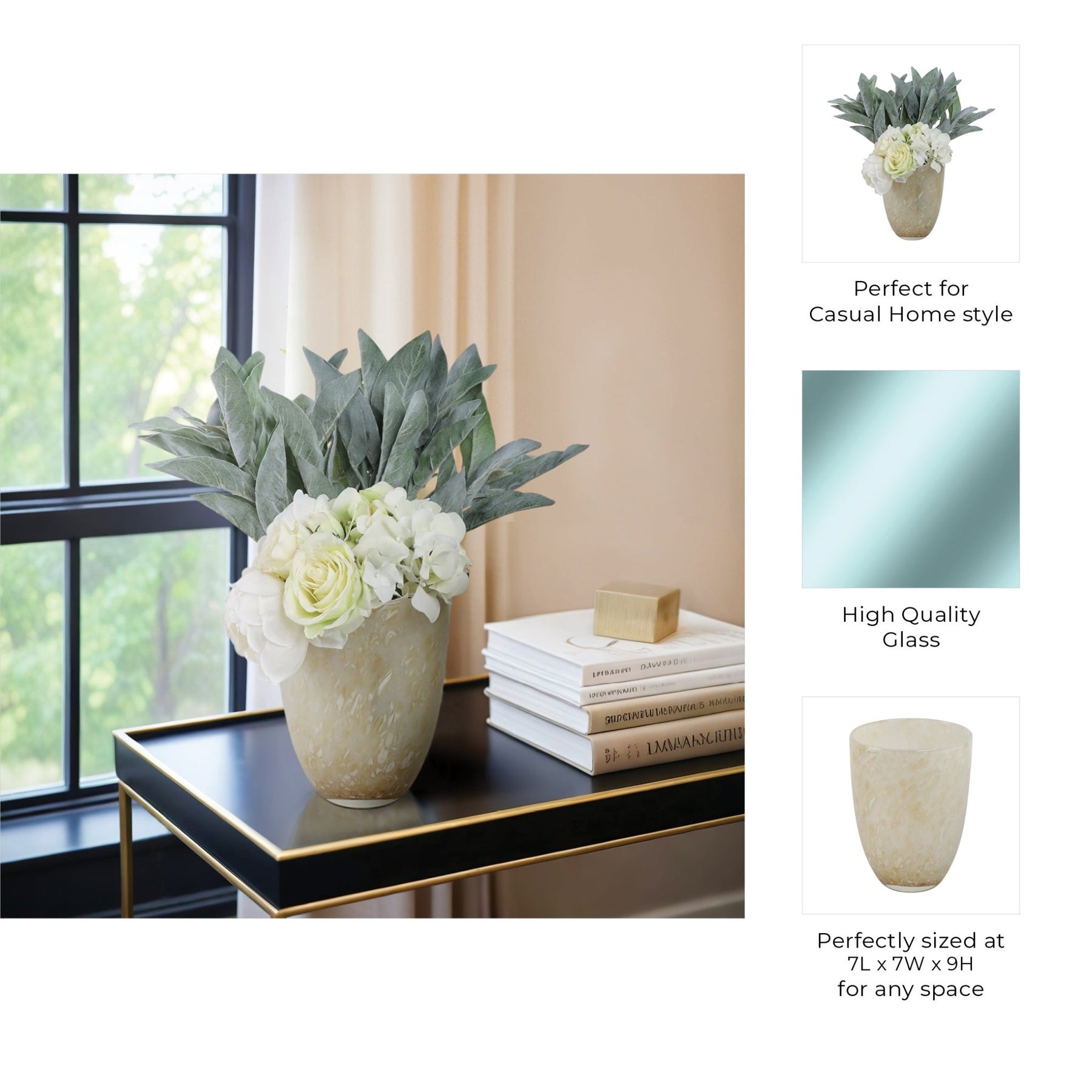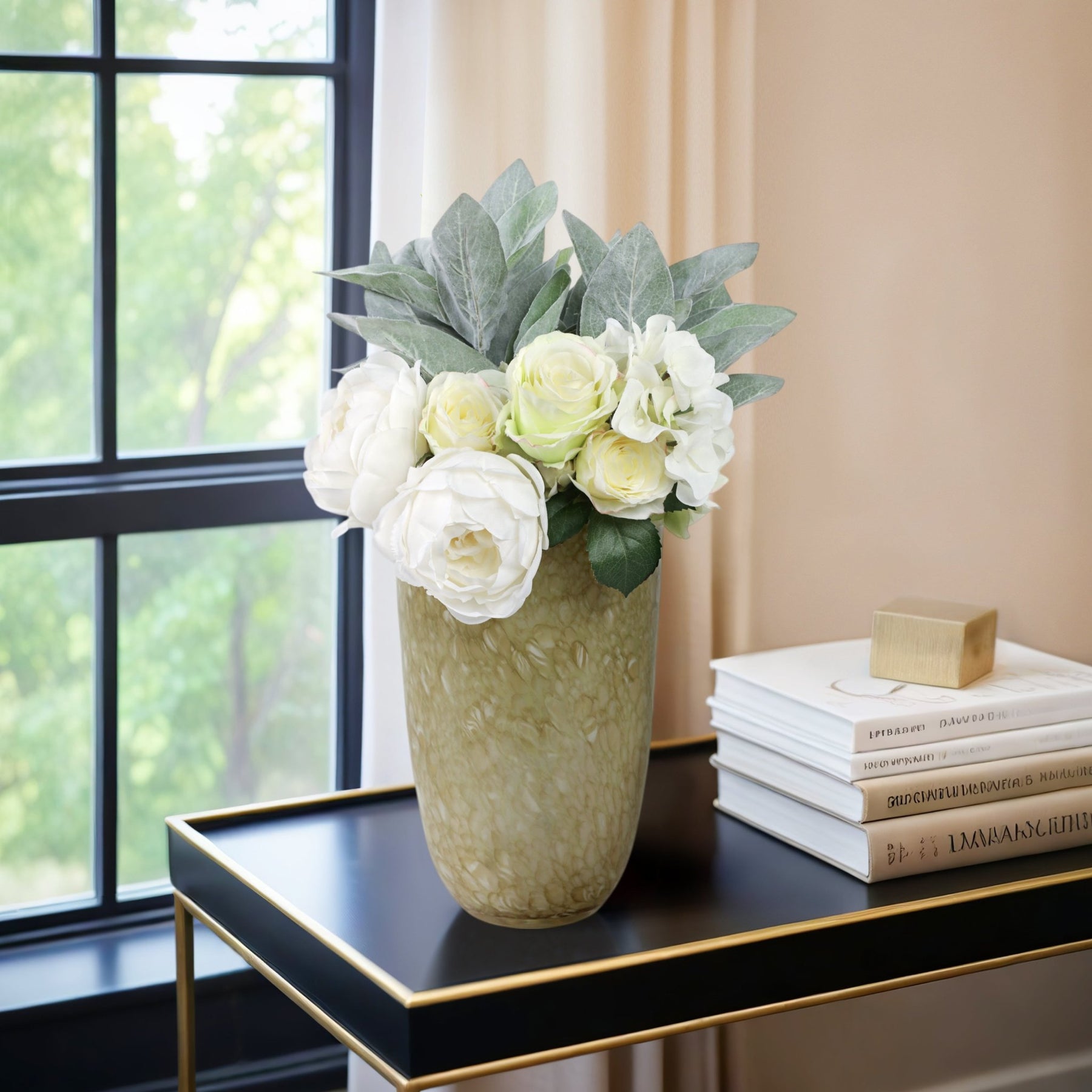 فازة زجاجية بتصميم أنيق بلون أخضر وكريمي