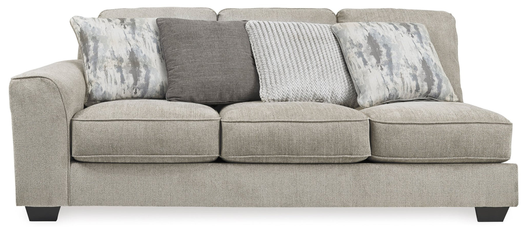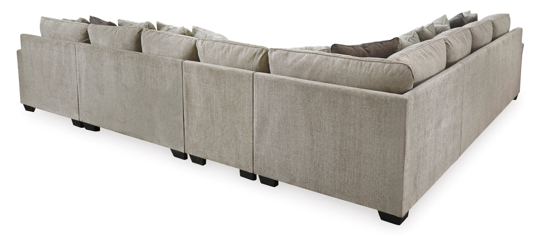 تتضمن 5 قطع: كرسي استرخاء زاوي مواجه للذراع الأيمن، أريكة بدون أذرع، كرسي بدون أذرع، أريكة مواجهة للذراع الأيسر وإسفين؛ "الذراع الأيسر" و"الذراع الأيمن" يصفان موضع الذراع عندما تواجه القطعة؛ تنجيد ووسائد من قماش الشنيل المصنوع من البوليستر؛ وسائد قابلة للعكس؛ وسائد إسفنجية عالية المرونة ملفوفة بألياف بوليستر سميكة؛ إطار محظور الزوايا؛ نظام قاعدة المنصة يقاوم الترهل 3 مرات أفضل من نظام الزنبرك بعد 20000 دورة اختبار من خلال توفير دعم أكثر توازناً؛ يحافظ أساس المنصة الأملس على مظهر محكم وخالٍ من التجاعيد بدون انخفاضات أو ترهلات يمكن أن تحدث بمرور الوقت مع أسس زنبركية متعرجة؛ أقدام مكشوفة بلمسة نهائية من الخشب الصناعي؛ 12 وسادة مميزة متضمنة