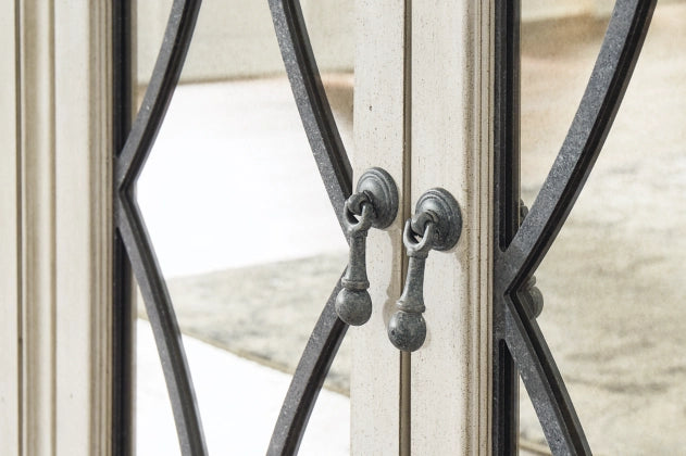 مصنوع من مواد صلبة من الخشب الصلب وقشرة التنوب وركائز MDF ومكونات من الراتنج المصبوب؛ لمسة نهائية مطلية باللون الأبيض العتيق؛ خزانتان بمرآة ذات بابين مع زخارف متداخلة، كل منهما مع رفين قابلين للتعديل
