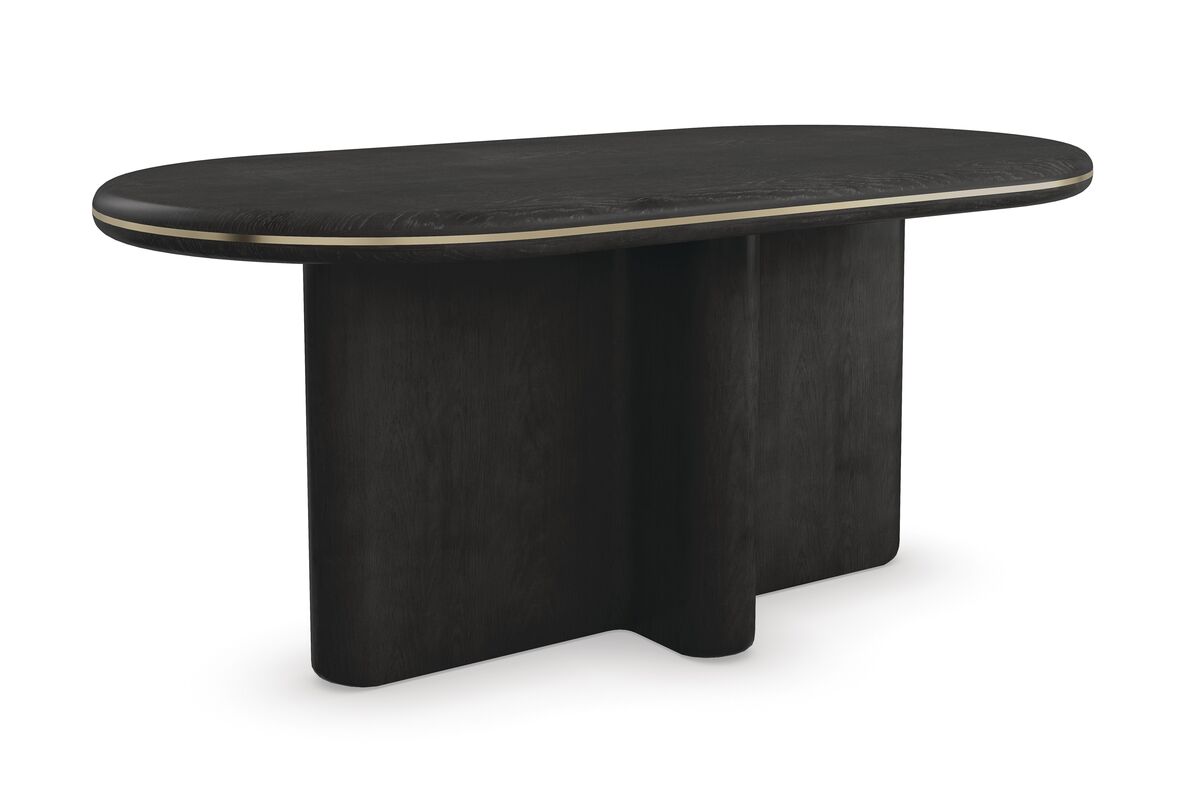 The Monty dining table complements perfectly, crafted from oak veneers with a moody Basalt finish that highlights the natural wood grain. A slender Polished French Gold band completes its timeless elegance. Together, they create a refined and inviting dining experience, ideal for both intimate dinners and grand gatherings.