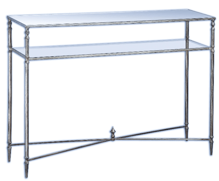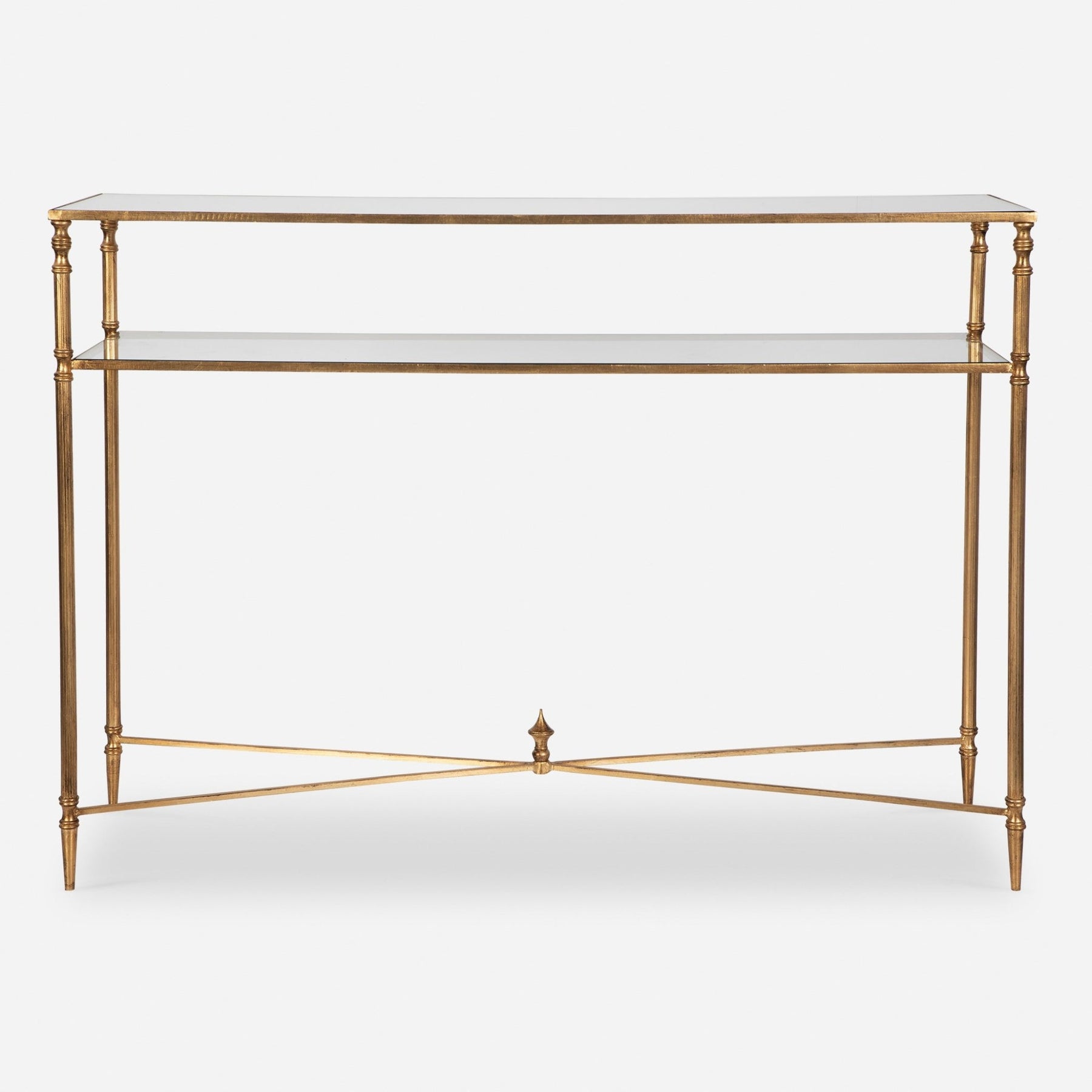 تصميم أنيق من الحديد مع لمسة نهائية متقاطعة من ورق الذهب مع لمسة عتيقة ثقيلة. الجزء العلوي عبارة عن مرآة مقواة ورف المعرض مصنوع من زجاج مقسّى شفاف.