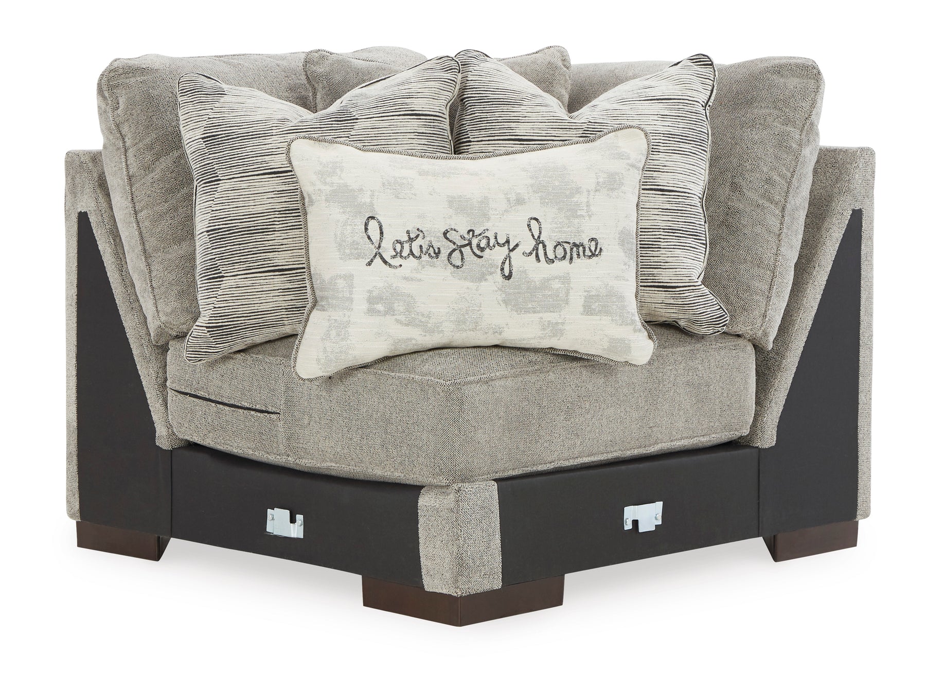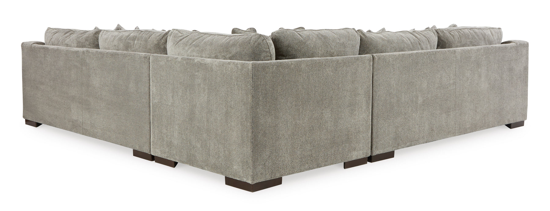 Includes 3 pieces: left-arm facing sofa, right-arm facing sofa and wedge ;"Left-arm" and "right-arm" describe the position of the arm when you face the piece;Corner-blocked frame;Reversible cushions ;High-resiliency foam cushions wrapped in thick poly fiber;Accent pillows included;Pillows with feather-fiber fill;Smoke gray polyester upholstery;Exposed feet with faux wood finish;Platform foundation system resists sagging 3x better than spring system after 20,000 testing cycles by providing more even support ;Smooth platform foundation maintains tight, wrinkle-free look without dips or sags that can occur over time with sinuous spring foundations