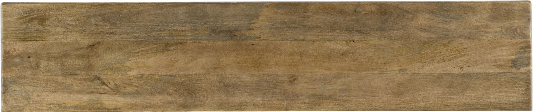 Mango Wood, German Silver and Iron come together for a tactile and stylish combination of mixed media in the Four-Door Entertainment Console. The medium wood finish has a metal chevron inlay, complemented by a metal base and thumb pulls. There’s one adjustable shelf behind each pair of doors. Accommodates up to an 80-inch TV.
