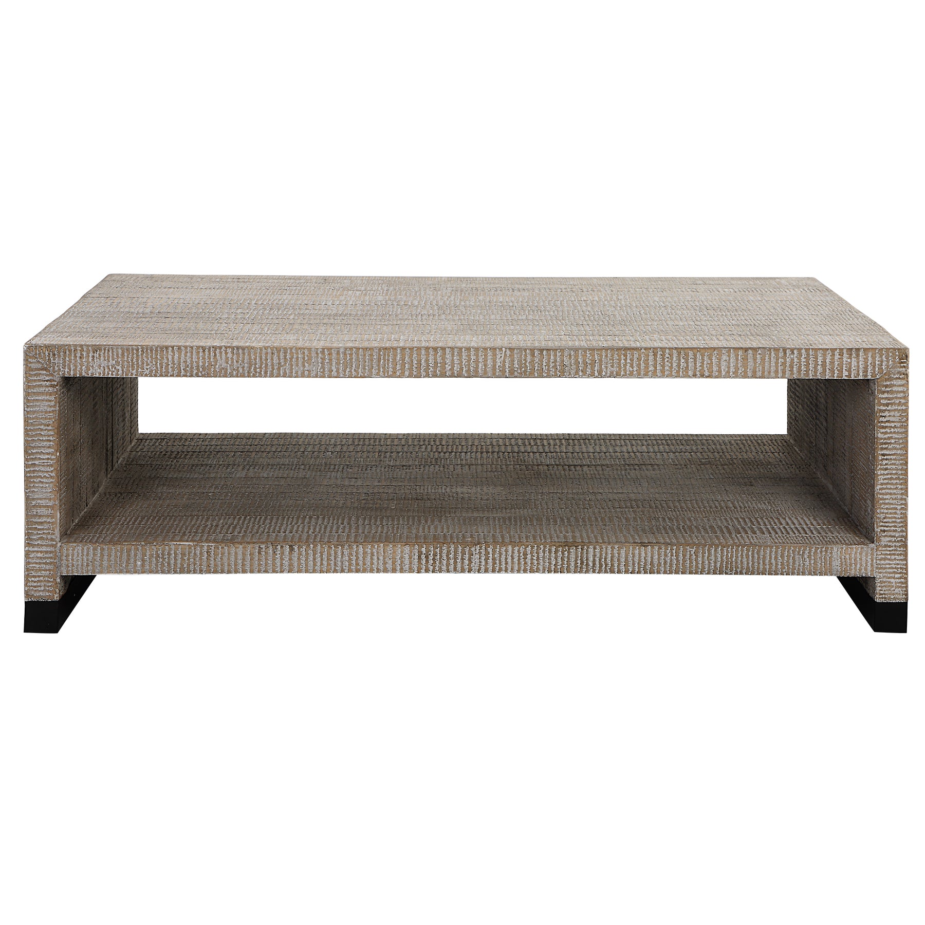 This Casual Coffee Table Provides Ample Display Space And Creates A Rustic Feel With Its Natural Wood Finish And Intricate Carved Details, Highlighted By A White Washed Glaze. Steel Feet Are Finished In A Natural Aged Black. Features: PINE, FIR, MDF, STEEL Dimensions (CM): H18.125 x W53.875 x D29.875
