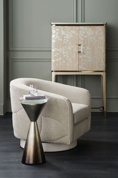 Bold and bubbly, this artful accent table delights the eye with its alluring design. A substantial, bevel-cut top in cast bubble glass adds sparkle to a reimagined, hourglass-shaped base, finished in a mix of shimmering silver leaf finishes. Captivating in form and function, it layers in light and a cool metallic, while offering the perfect place for a chilled cocktail and your favorite spy novel.