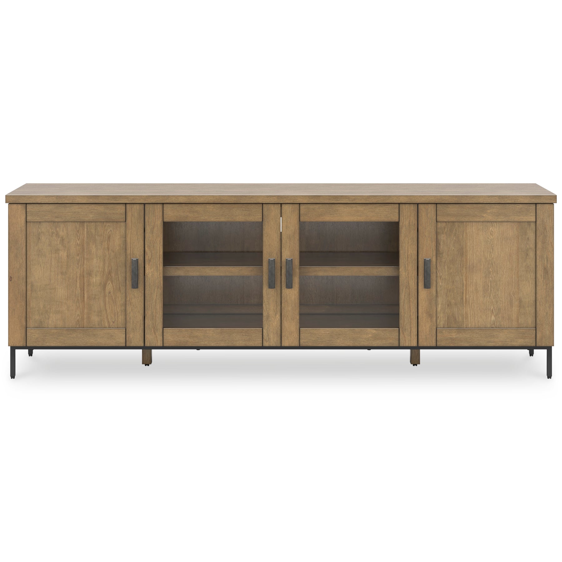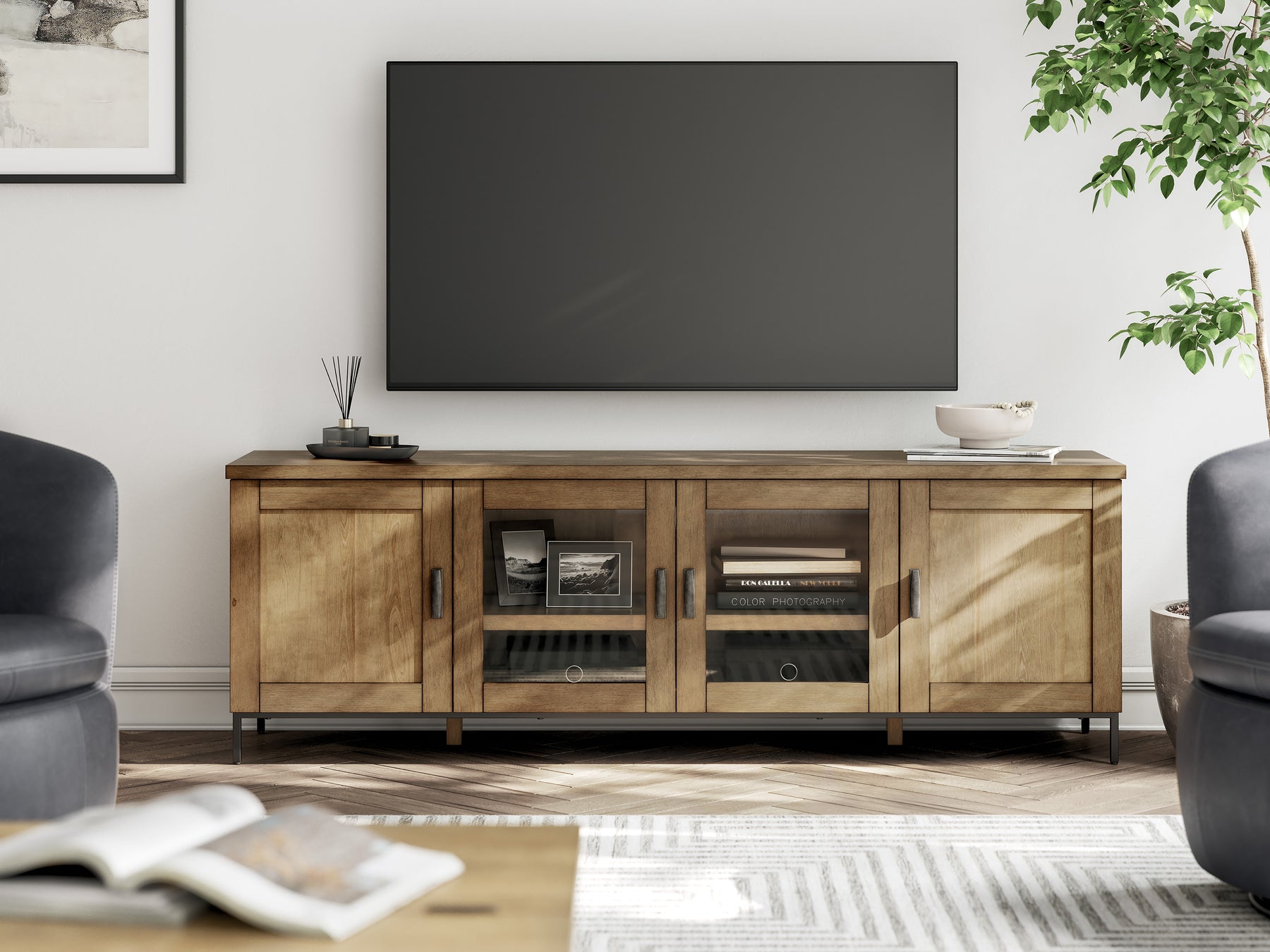 Made for the everyday, this TV stand is a sleek complement to your casual contemporary living room. You’ll love the refined-yet-relaxed vibe of its contrasting medium brown finish and matte black legs. Concealed and glass-front cabinets make media storage a breeze. And for added function, cord management holes throughout the piece make connections easier.