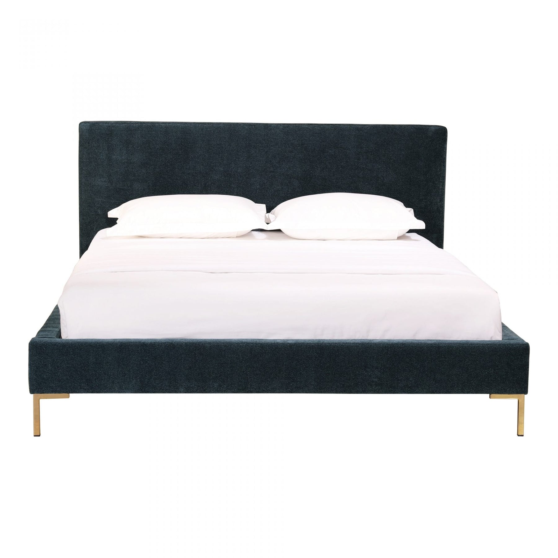 Perfect to breathe new life into your bedroom, Astrid was designed with comfort, luxe, and quality in mind. It is fitted with clean lines and a solid pine frame wrapped in a midnight blue velveteen fabric, complete with a padded and upholstered headboard and golden leg accents. This contemporary modern King bed is the sort of simple pleasure you need for a seriously stylish sleep.