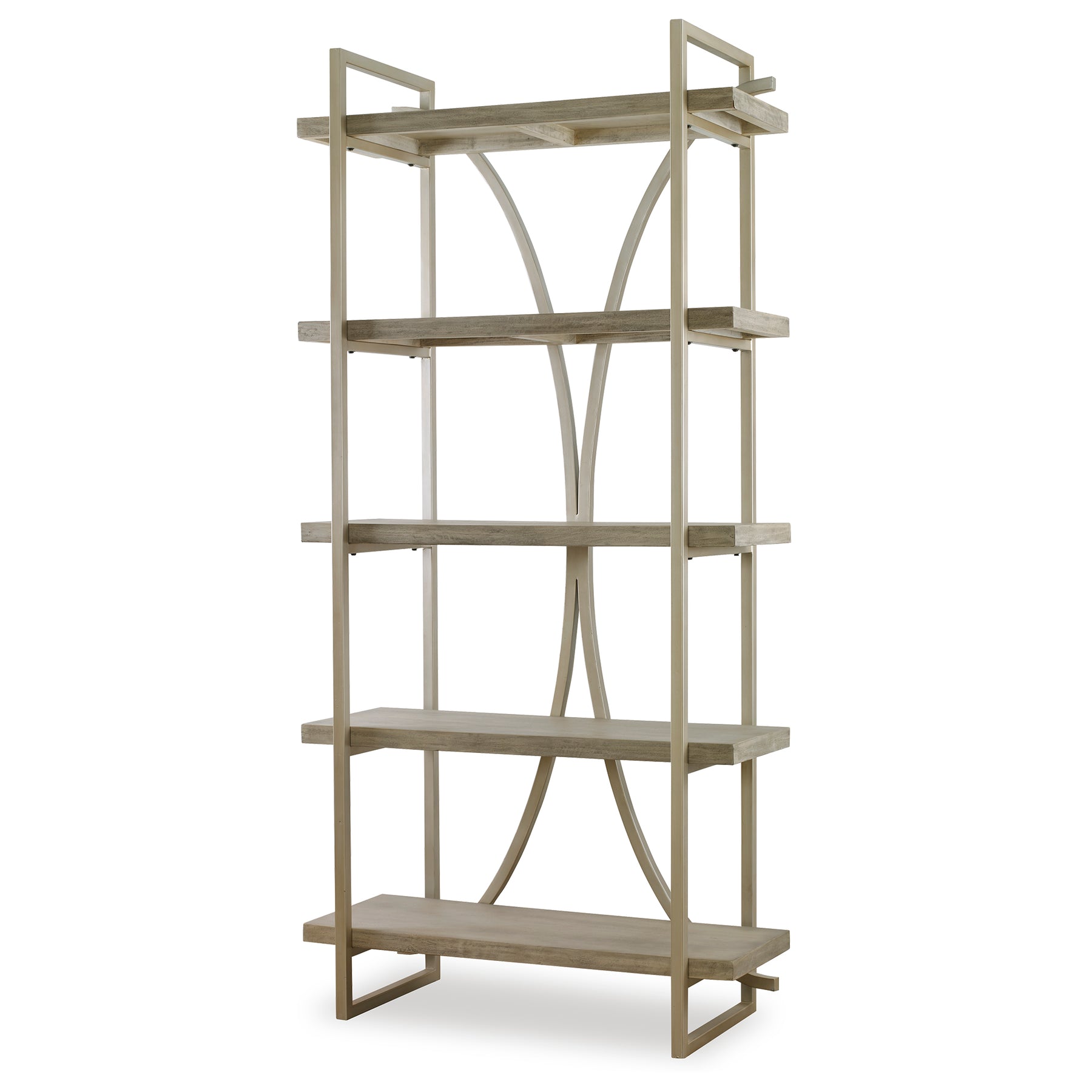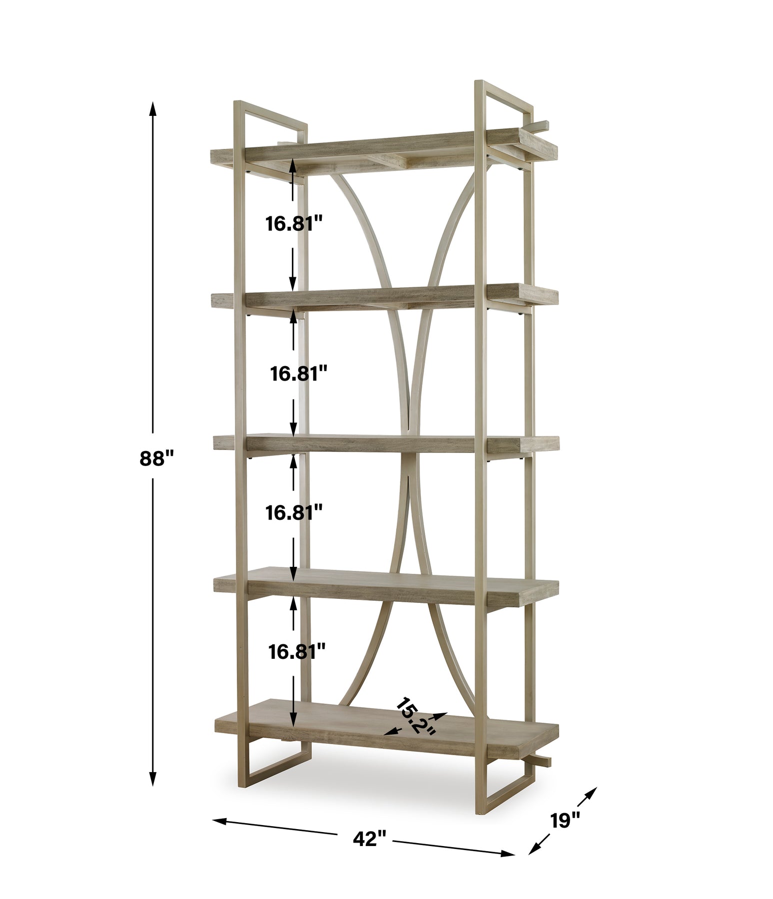 A Classic Contemporary Piece To Transcend Styles, The Sway Etagere Features A Metal Framework Finished In Soft Silver Leaf With Light Antiquing. Shelves Are A Mango Wood Veneer In Distressed Gray With Bone Ivory Undertones.