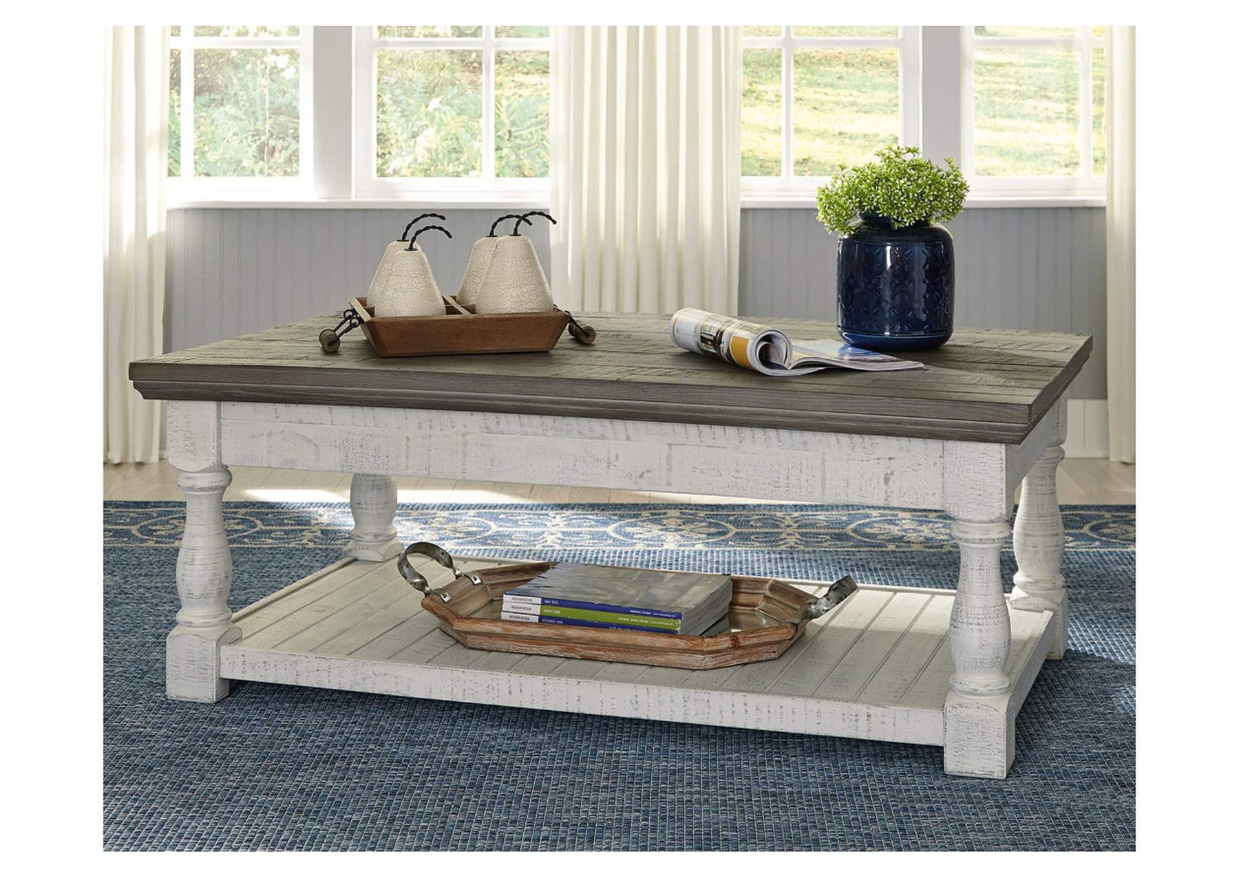 With its richly rustic finish and textural mix, the Havalance lift-top coffee table goes to town on bygone beauty. Its distressed two-tone treatment blends a weathered gray with vintage white for an utterly charming effect. The lift-top design adds function to your very comfortable space.
