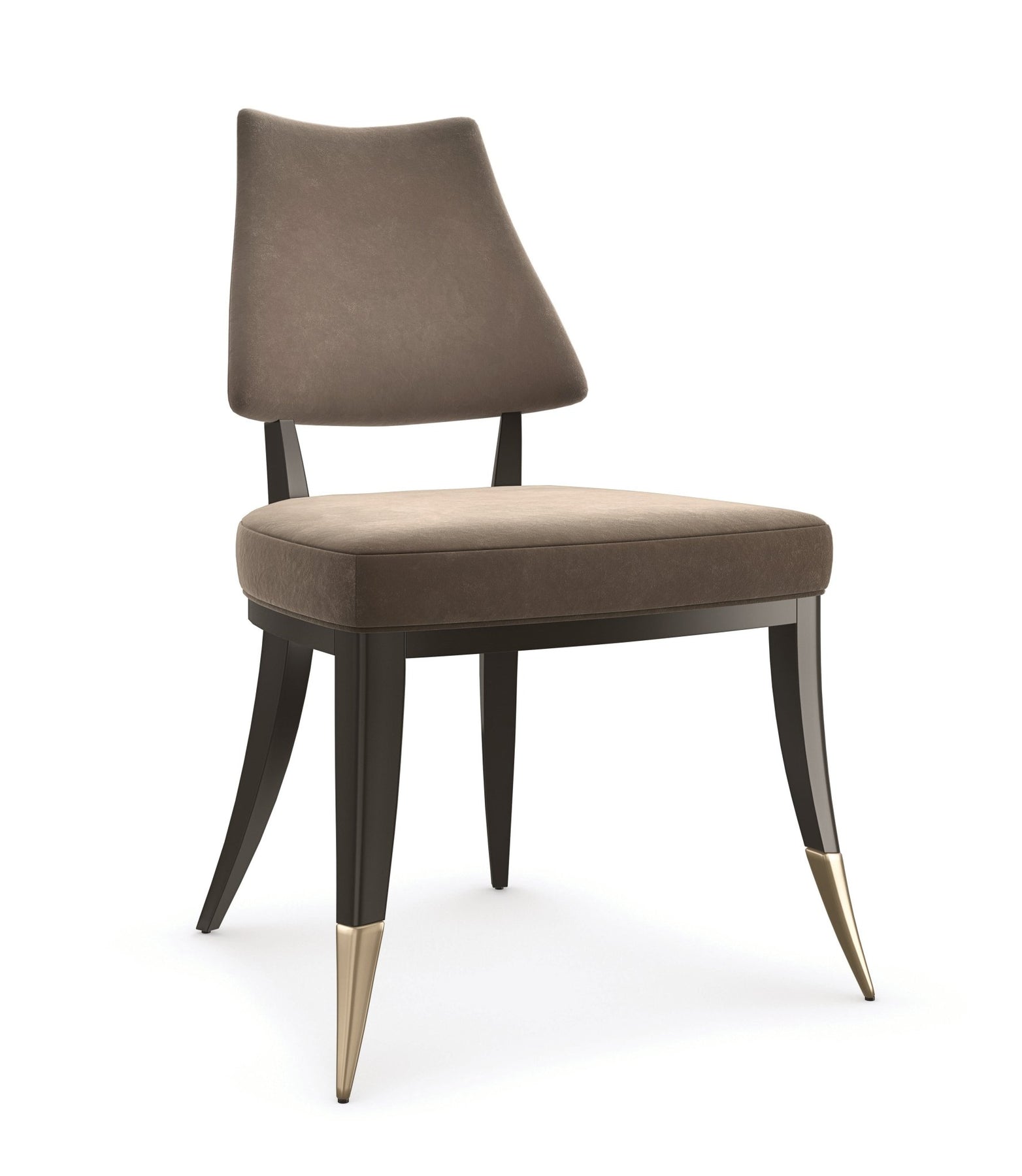 Reminiscent of a French antique, this petite dining chair features a soft, sculpted back and plush seat, perfect for entertaining and lingering conversations around the table. Tall, tapered legs with an outward curve are the perfect complement to this soulful silhouette, impeccably dressed in a smoky taupe velvet. Brushed Gold metal ferrules lend a luxe finishing touch.