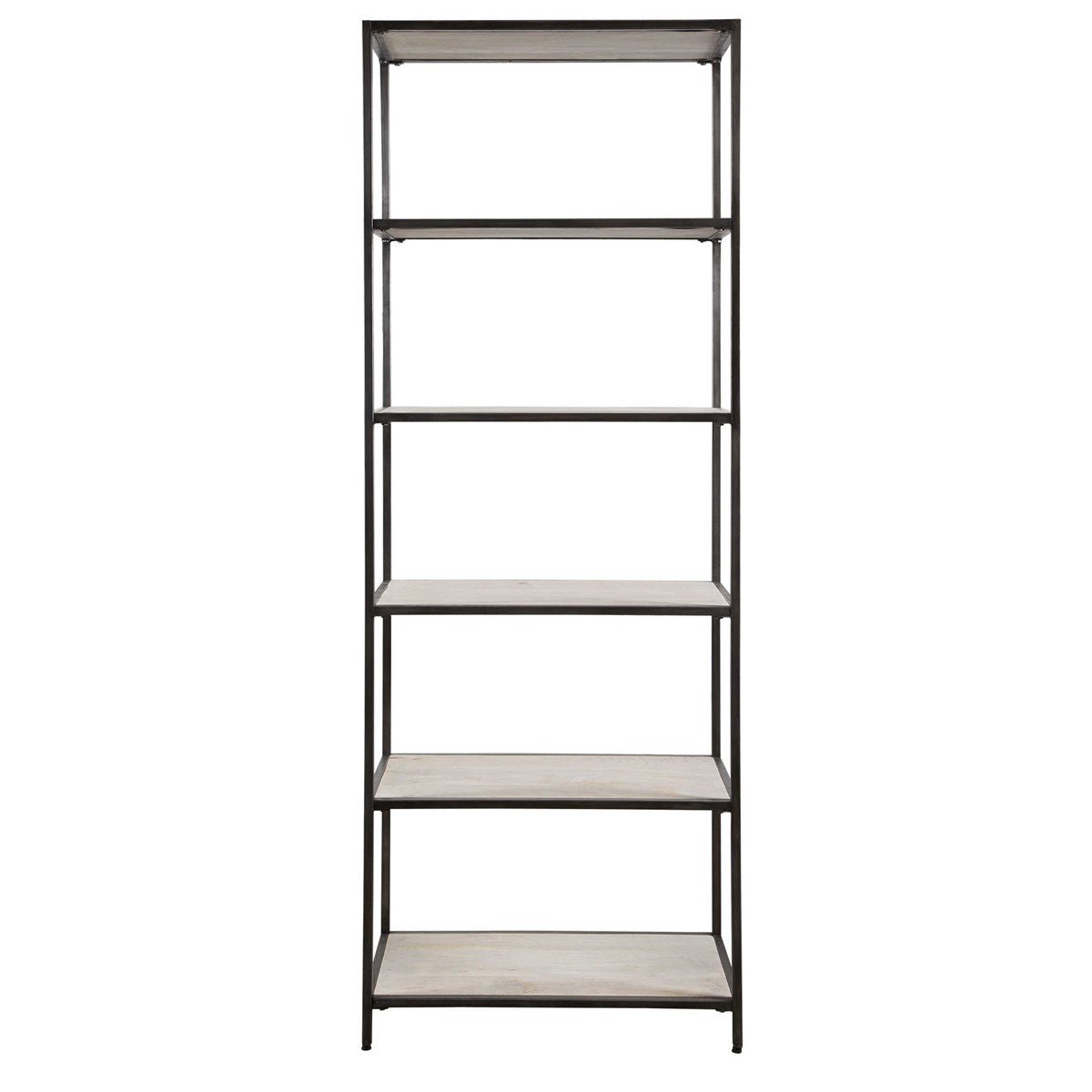 Boasting with display space, the Baldwin Etagere is a versatile and streamlined piece that has a place in any home. The iron frame is finished in clean gunmetal with 5 shelves in white washed mango wood. Distance between shelves is 16".