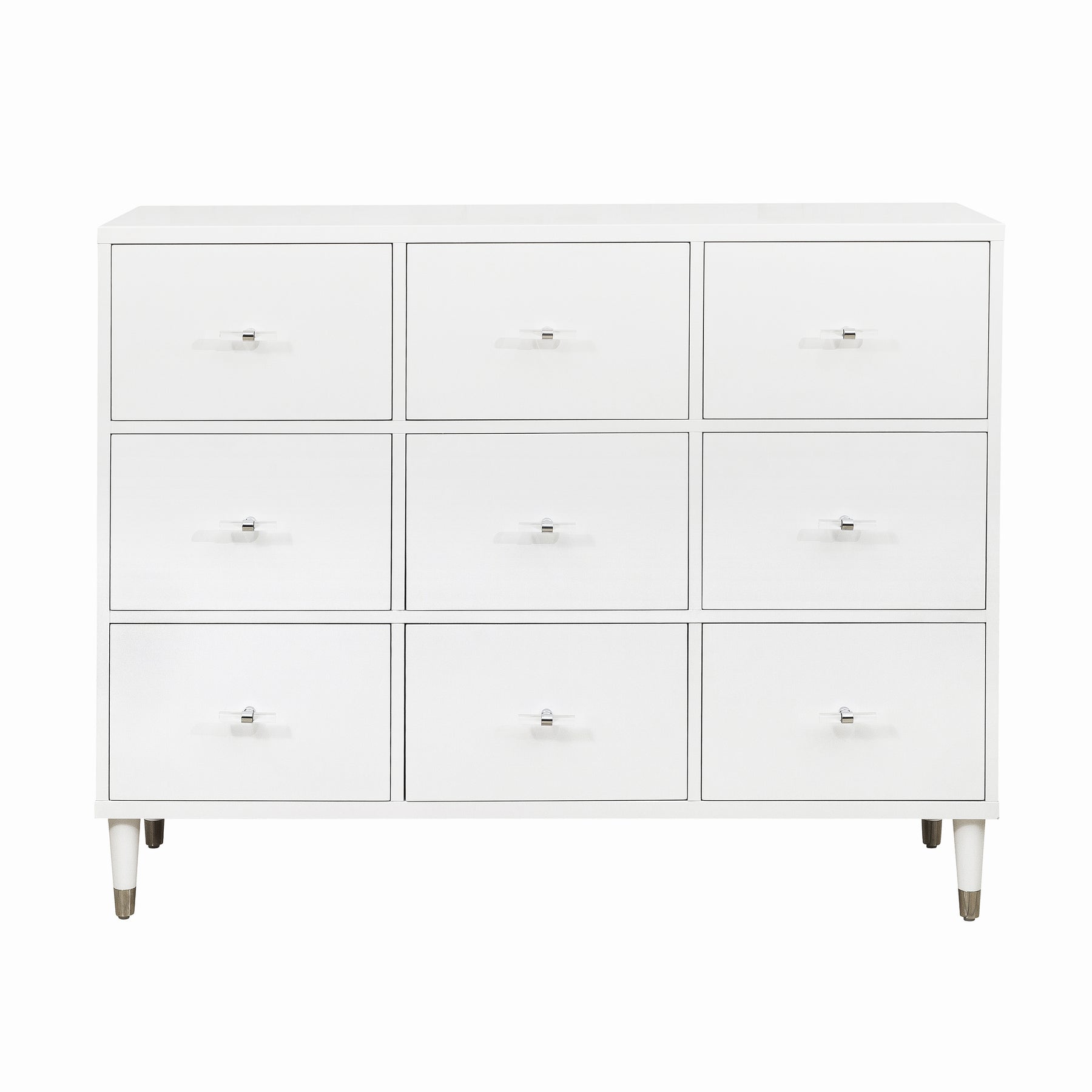 51.500" L x 18.750" W x 38.000" H Color: White Material: Solid Wood Features: A mix of modern and contemporary styling,9 Drawers for ample amounts of space for storing clothing, spare linens, and more,Stark white finish for style versatility,Each drawer has its own polished nickel pull,Solid wood and engineered wood construction,Partial assembly required; complete set up in 15-30 minutes