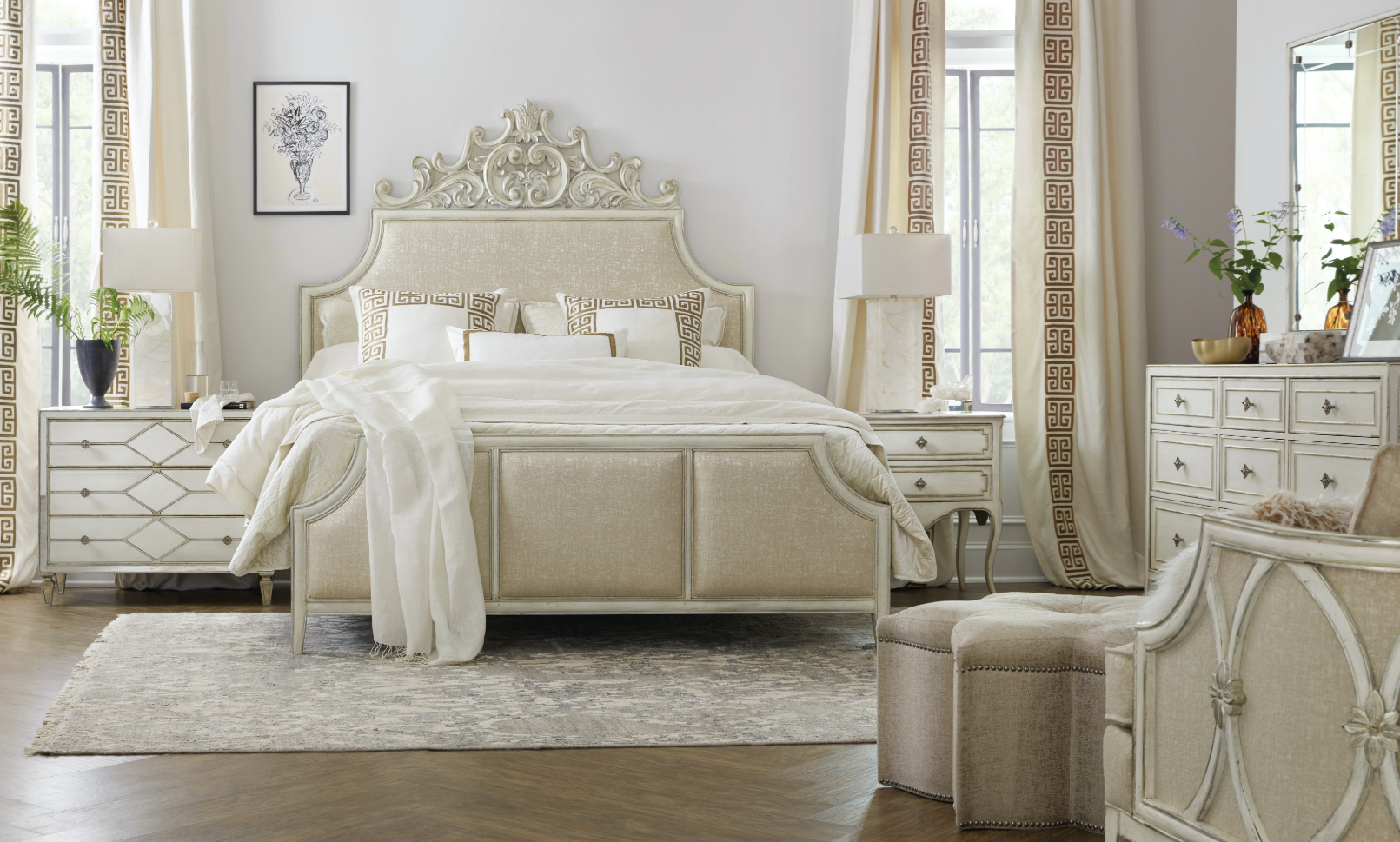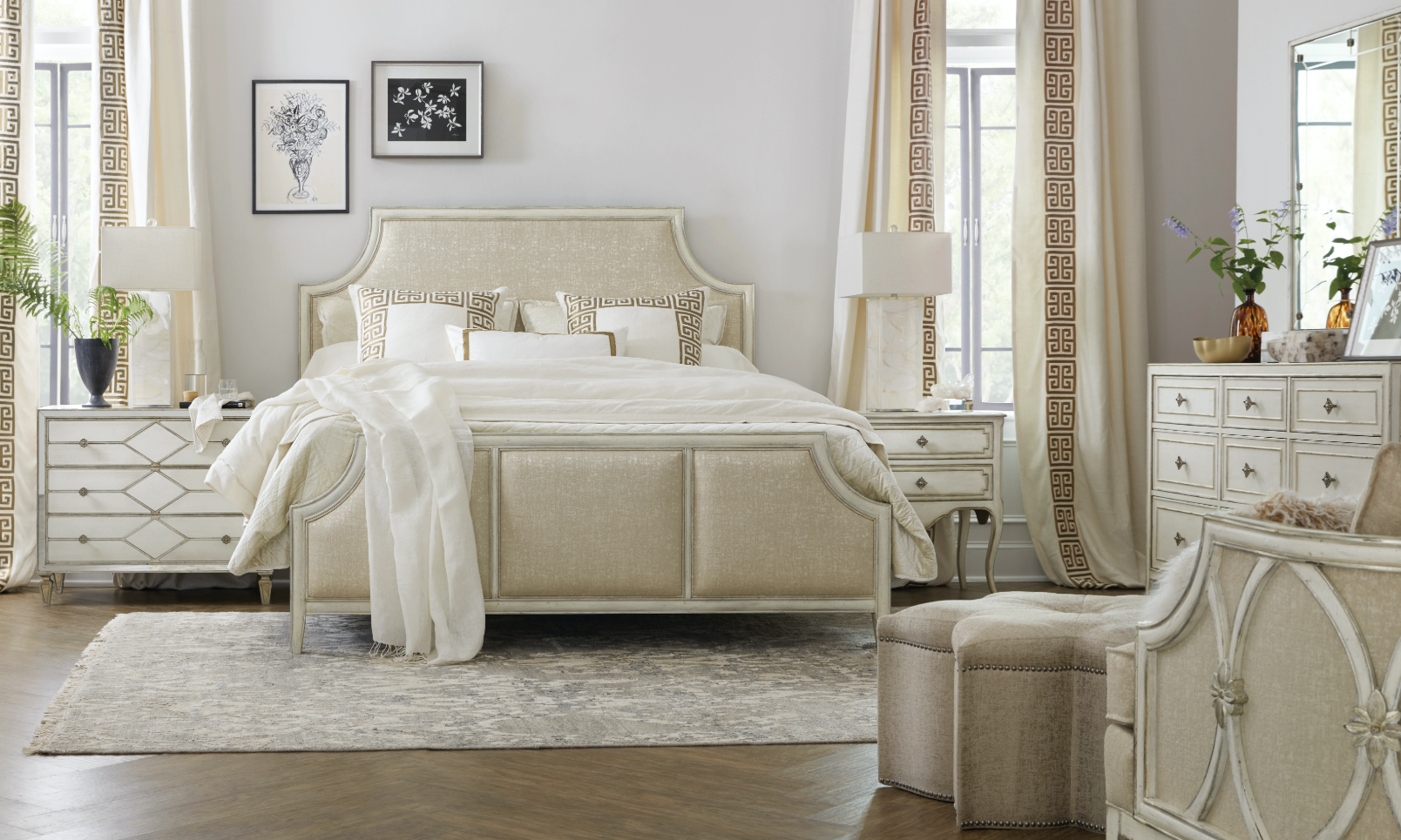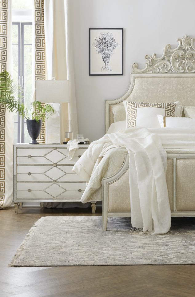 Simply magical, this shimmering beauty adorned with reverse painted glass drawer fronts in a creamy white finish looks like it belongs in a fairytale with a happy ending. The dreamy drawer fronts are paired with a silver finish on the case with rich undertones of gold and champagne. Jewelry-like hardware is in an antique silver color. Included is a power bar with 3 electrical outlets and one live USB port and an underneath light with 3-intensity touch switch. The top drawer has a cream-colored removable felt liner and the bottom drawer is cedar-lined.